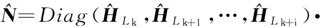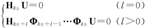 证明 当SLAM系统满足式(30)时,观测矩阵所有行具有相同的不可观测向量个数,该数量与 U的列数相同.机器人和路标的真实位置在未知环境中不能获得,因此,选取路标和机器人第一次被估计位置分别作为路标和机器人的初始位置,仿照式(22)构造 U矩阵.