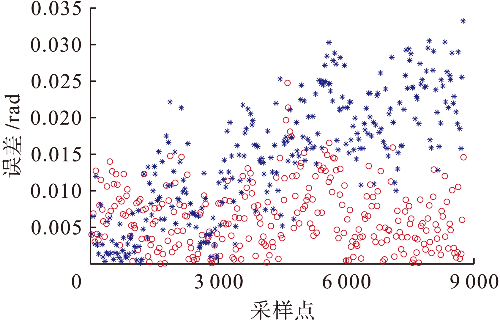 ,改进前后的位置误差曲线与角度误差曲线如图3、4所示(图中星号为标准卡尔曼滤波算法的误差,圆圈为改进卡尔曼滤波算法的误差).
