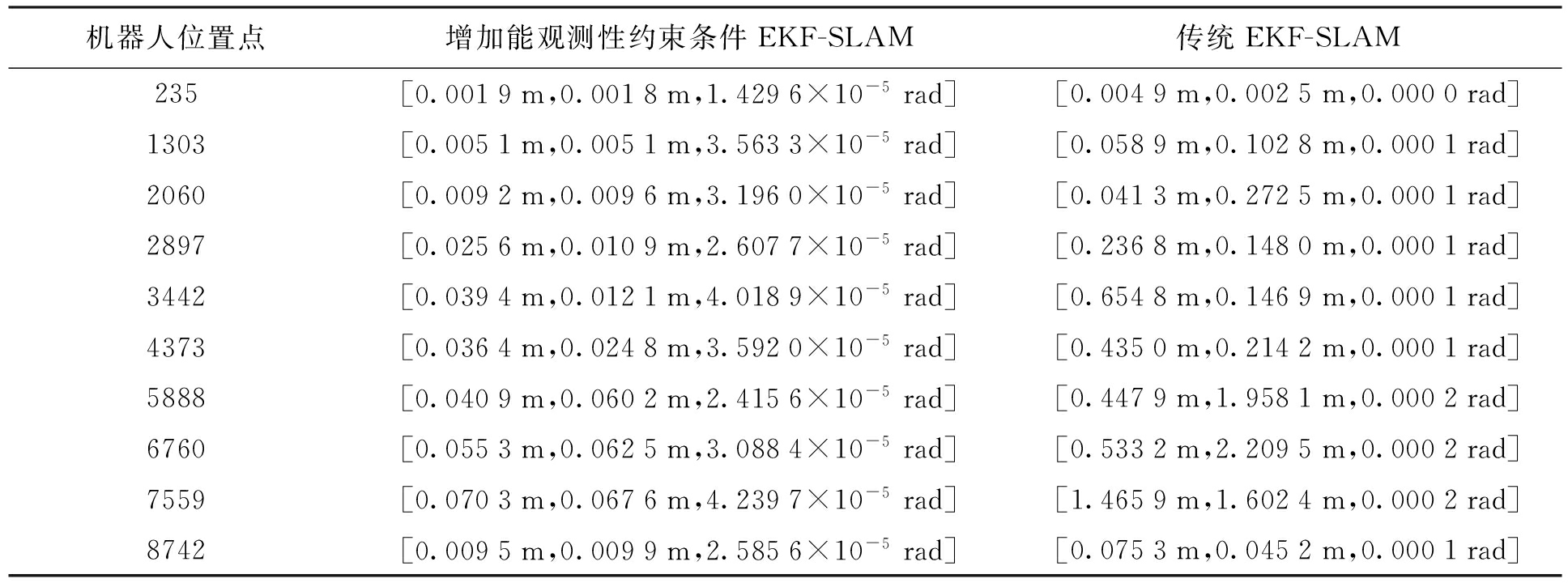 机器人状态协方差是衡量估计精度的重要指标,随机选取10组本文算法和EKF-SLAM算法的机器人状态协方差进行比较,结果如表1所示.