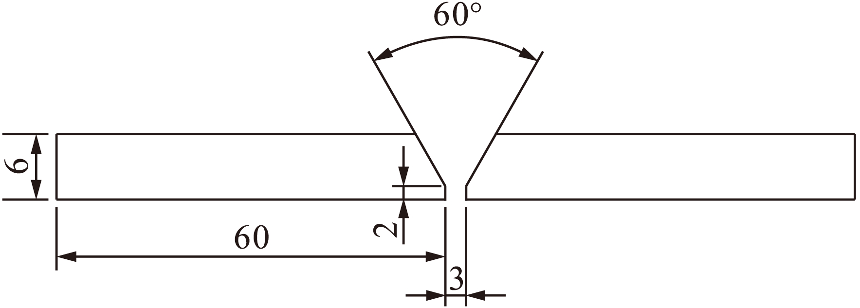 焊接接头采用V形坡口平板形式对接,板材试样尺寸如图1所示(单位:mm).其中,坡口角度为60°;钝边宽度为2 mm;板间距为3 mm.坡口采用机械加工方法制备,焊前需要对坡口进行除锈打磨.为了减小热输入对试验结果产生的影响,试板焊前不需要进行预热处理,采用单层单道焊的焊接方法.保护气体选用Ar与CO2的混合气体(Ar与CO2的体积分数比为4∶1),气体流量为16~17 L/min,焊接电压为24 V,焊接电流为220 A,焊接速度为4 mm/s.焊接时施加的磁场电流分别为1、1.5、2、2.5和3 A,施加的磁场频率分别为5、10、15、20和25 Hz.