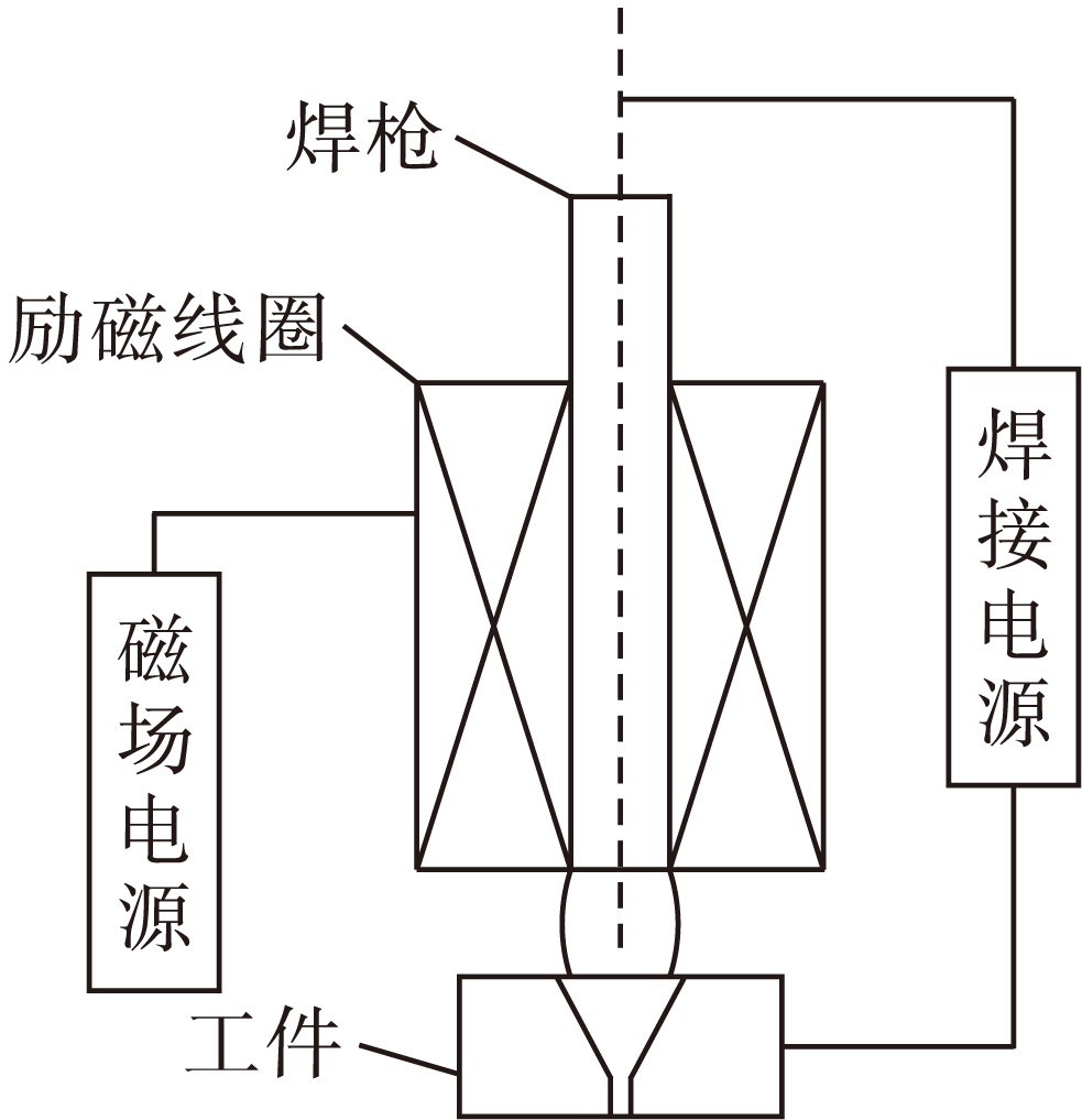 试验中采用外加纵向磁场辅助MAG焊的焊接方法,试验装置示意图如图2所示.焊接磁控系统主要由磁场电源和励磁线圈组成,且励磁线圈套于焊枪上.在焊接过程中,可以通过调节磁场电源的电流和频率,改变作用于焊接熔池的磁场参数.