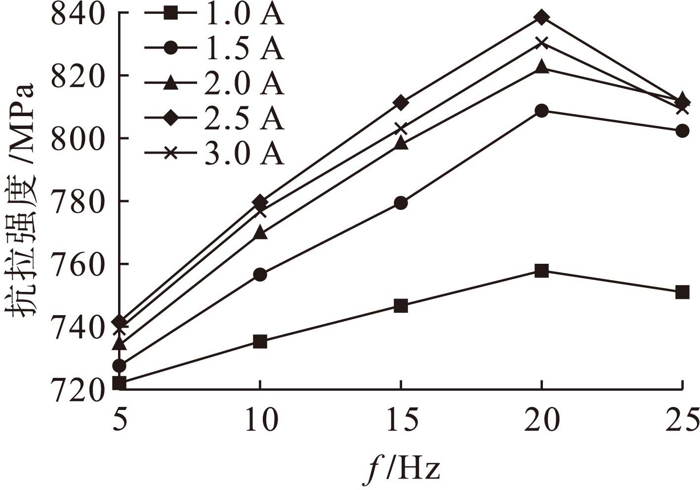 图5 焊接接头的抗拉强度随磁场频率的变化