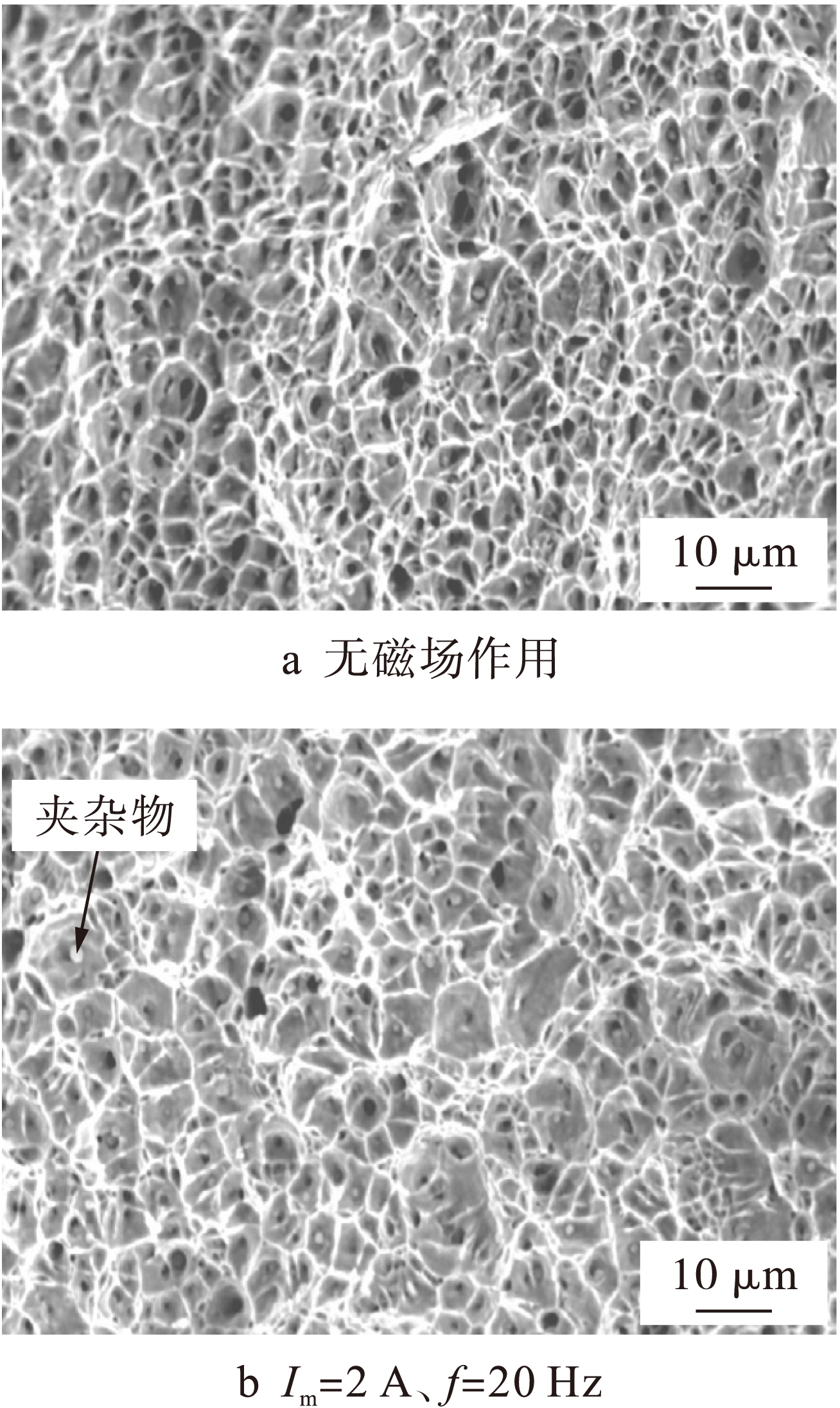 图7为低合金高强钢焊接接头的低温冲击断口的微观组织.由图7可见,焊接接头断口形貌为典型的等轴韧窝,且韧窝底部为夹杂物或微孔,表明韧窝的产生机理为微孔聚集型断裂.当未施加纵向磁场时,焊接接头断口的韧窝较浅且尺寸较小(见图7a).当励磁电流为2 A、磁场频率为20 Hz时,焊接接头断口中大韧窝数量明显增多,且韧窝深度也有所增加(见图7b).