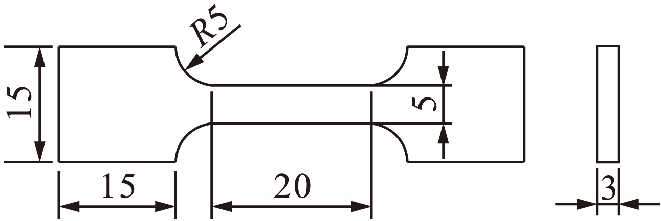 完成焊接后,将焊件制备成相应的试件,并进行拉伸和冲击力学试验.根据GB/T 2649-1989的规定,应在垂直于焊缝方向获取拉伸试件,且拉伸试件尺寸如图3所示(单位:mm).利用电子万能试验机对试件进行拉伸试验,设定拉伸速率为5 mm/min,拉伸试验应进行至试样断裂为止.结合计算机分析,可以得到焊接接头的拉伸性能参数.在相同条件下,对每组试验分别进行3次,取其平均值作为该组试验的测定值.根据金属材料力学性能取样标准,在垂直于焊接方向上截取冲击试件,去除焊缝余高后,制得尺寸为5 mm×10 mm×55 mm的非标准冲击试件.冲击试件的缺口深度为2 mm,V型角度为45°,试验温度为-20 ℃.采用OLNMPUS BX-6型光学显微镜对焊接接头进行显微组织观察与分析.