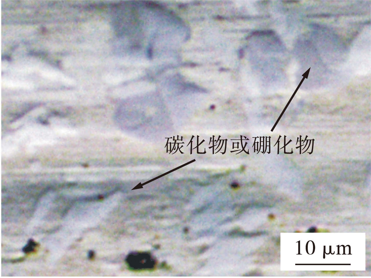CO2激光熔覆层磨损后的表面形态如图8所示.由图8可知,磨损后的熔覆层表面具有突起的硬质相(硼化物或碳化物).通过测量和计算可知,在CO2激光熔覆层的磨损表面中,硬质相所占的体积分数约为46%.CO2激光熔覆层的硬质相尺寸较为细小,尺寸约为5 μm.硬质相的存在显著提高了熔覆层的耐磨性能.随着硬质相体积分数的增加与尺寸的减小,熔覆层耐磨性能将会随之提高.