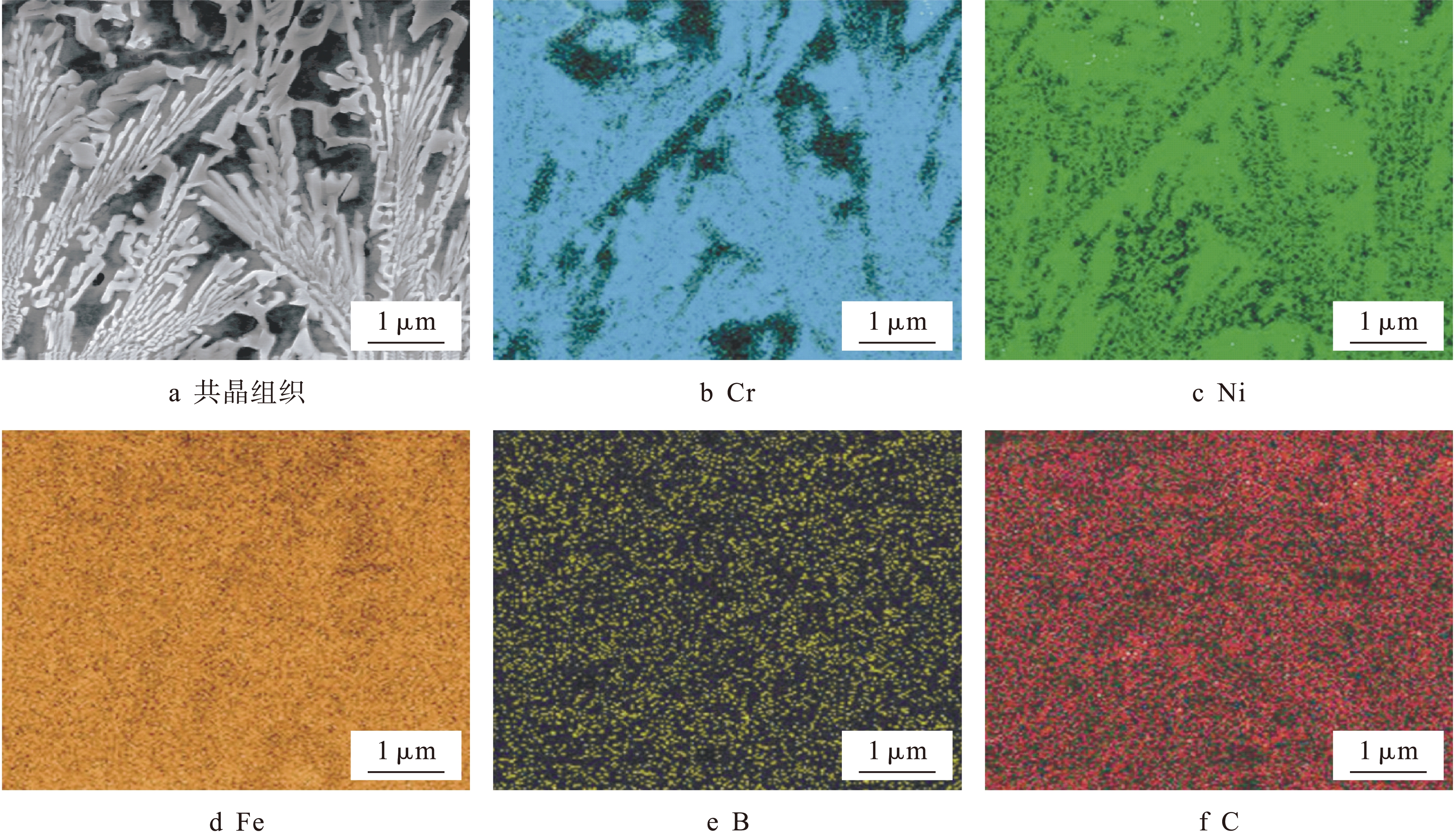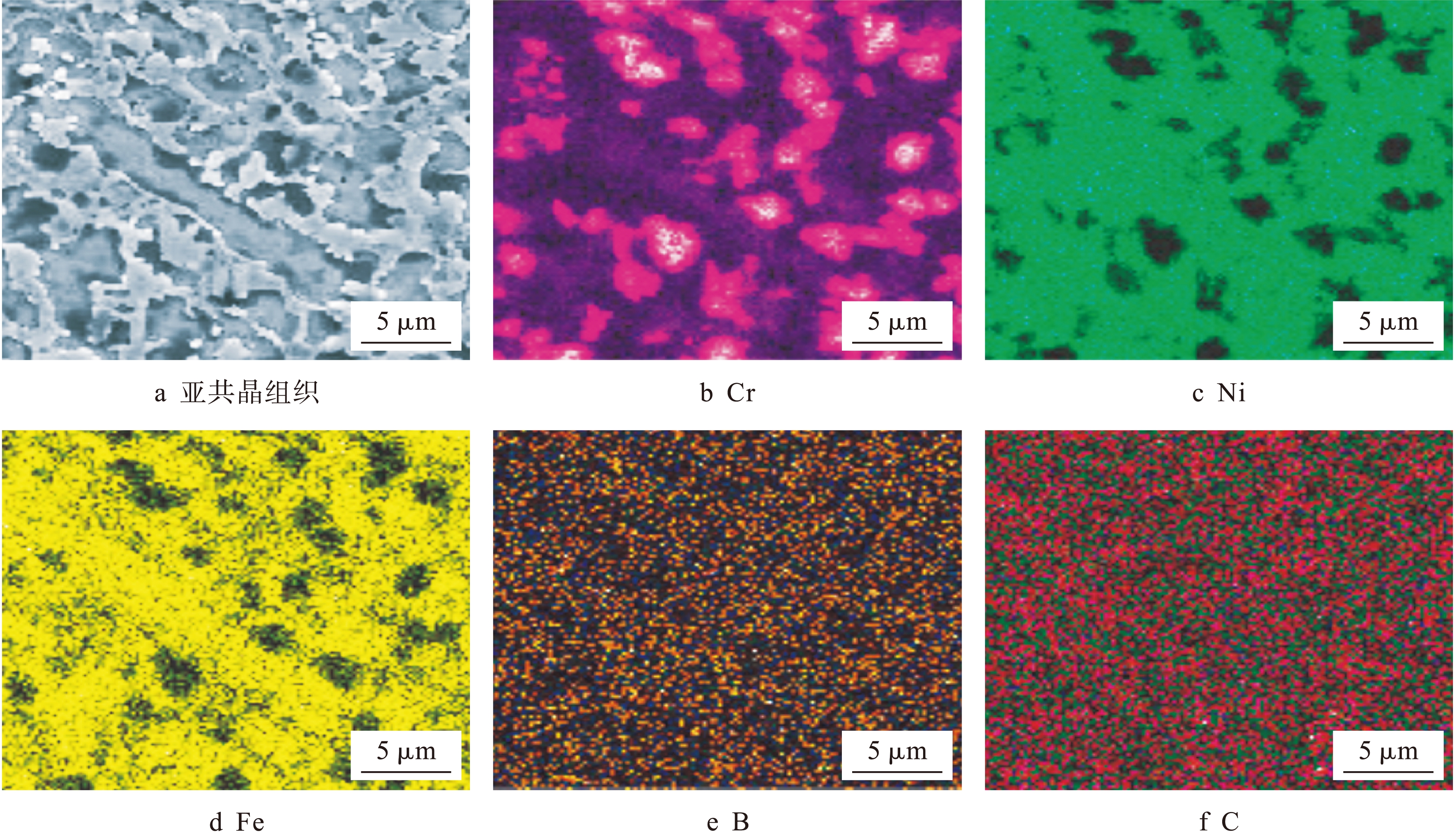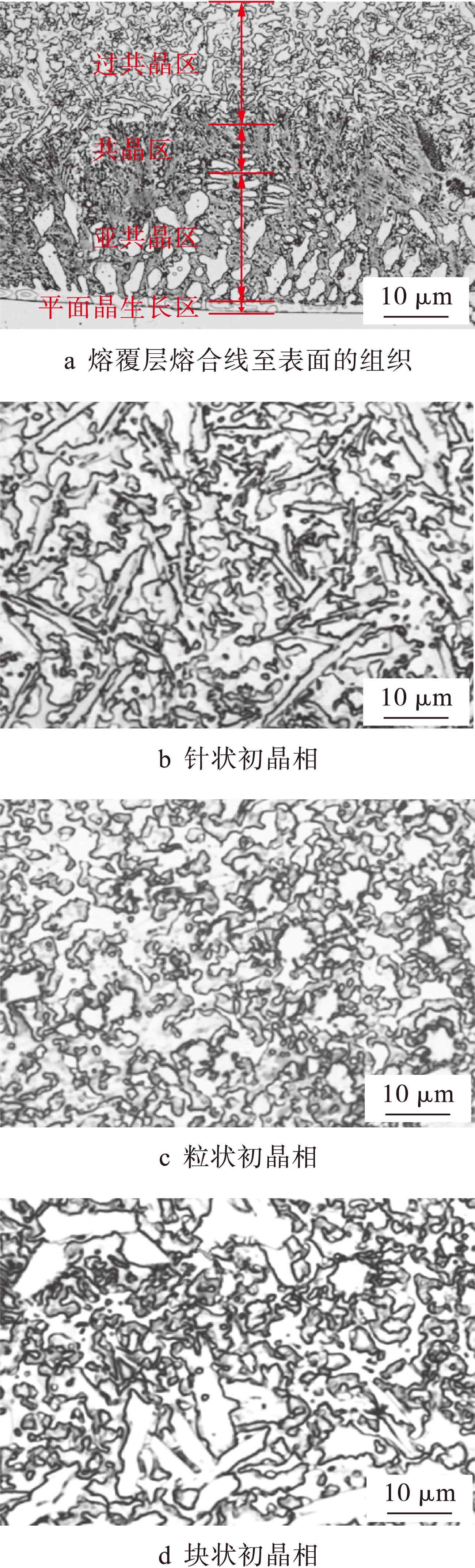 CO2激光熔覆层的显微组织如图11所示.由图11可见,熔覆层的上部组织由过共晶组织组成.从熔覆层熔合线到表面的组织依次为平面晶生长区、亚共晶区、共晶区和过共晶区(见图11a).过共晶组织中的初晶相形态可以呈现针状(见图11b)、粒状(见图11c)和块状(见图11d).初晶相的最