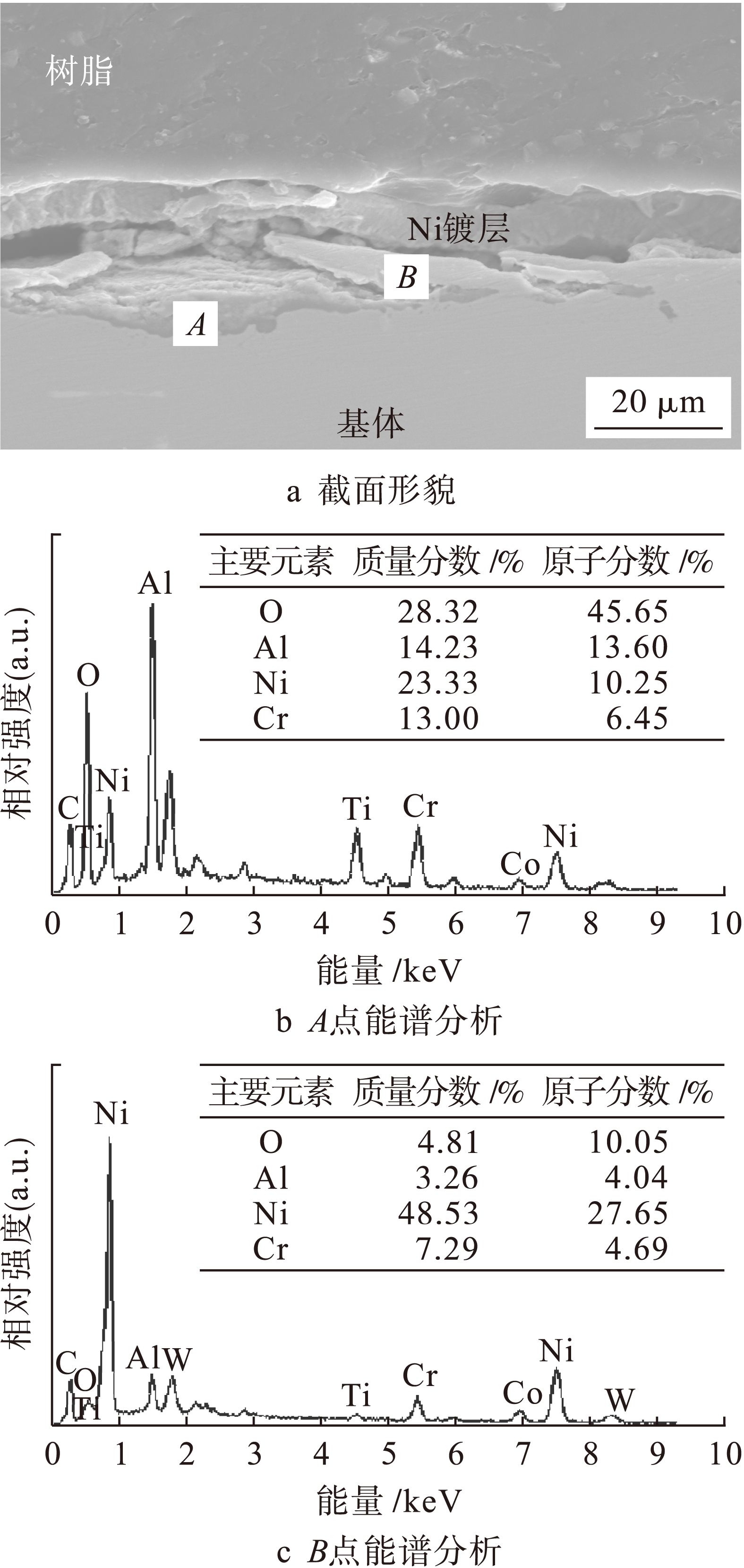 图2 Ni基合金试样的截面形貌及EDS分析