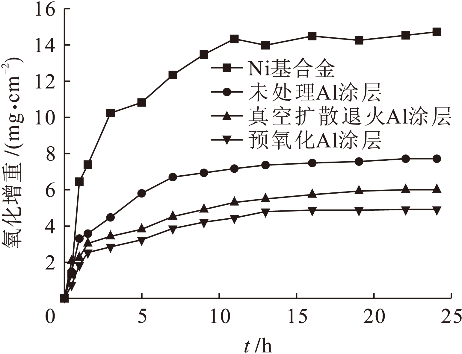 4) 经过真空扩散退火和预氧化处理后,Al涂层试样氧化膜的生长机制不同.真空扩散退火处理后形成的NiAl易使氧化膜脱落,而预氧化处理后形成的氧化膜更为紧密,因而预氧化处理比真空扩散退火处理更能提高Ni基合金的抗氧化性能.