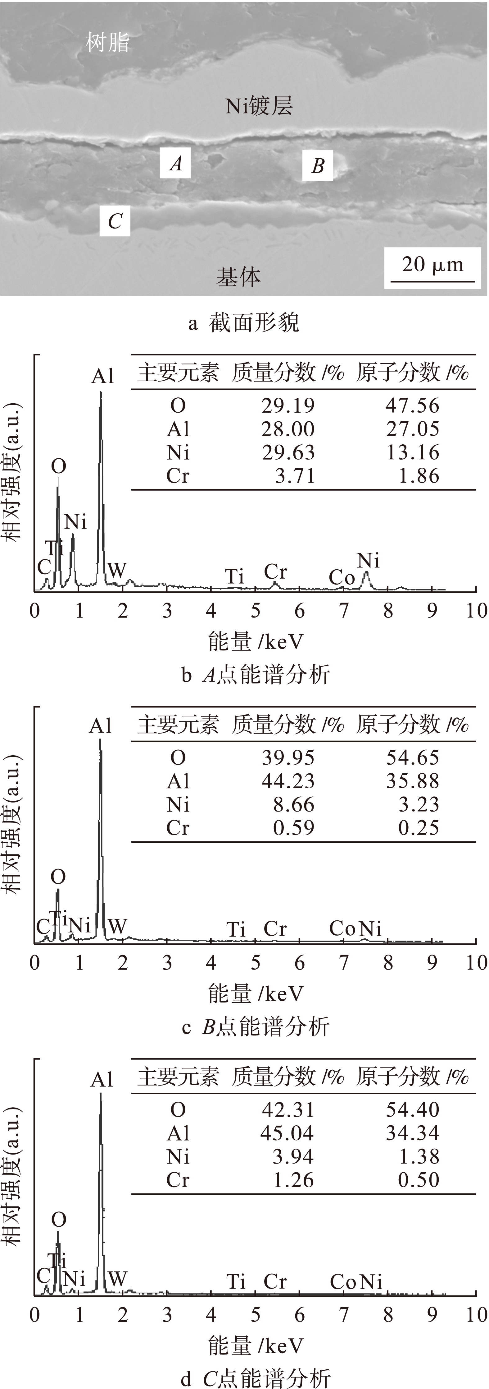 图3为Al涂层试样经过24 h氧化后的截面形貌与能谱分析.可见,Al涂层试样的氧化膜薄于Ni基合金试样,且较为疏松.结合能谱分析可知,Al涂层试样的氧化膜可以分为三层,外层为NiO、Cr2O3、Al2O3的混合氧化物和少量尖晶石氧化物,中间层主要为Al2O3,内层为少量NiO.