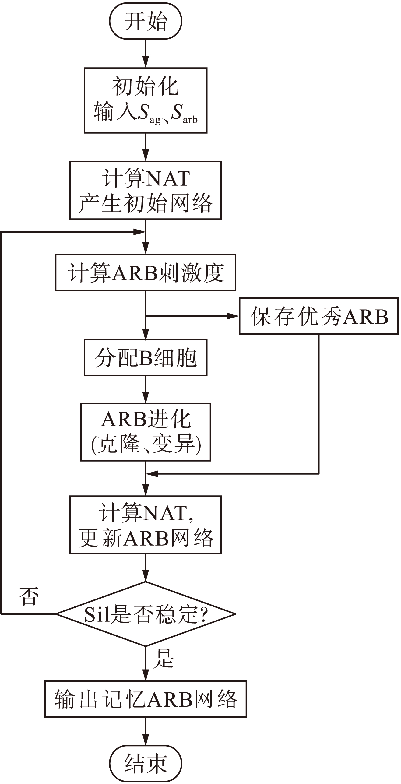 为除了ARBkn以外的Sarbk.将ARB按刺激度由大到小排列,复制前5%的优质ARB直接参与新网络的生成,即直接进化为新一代ARB.