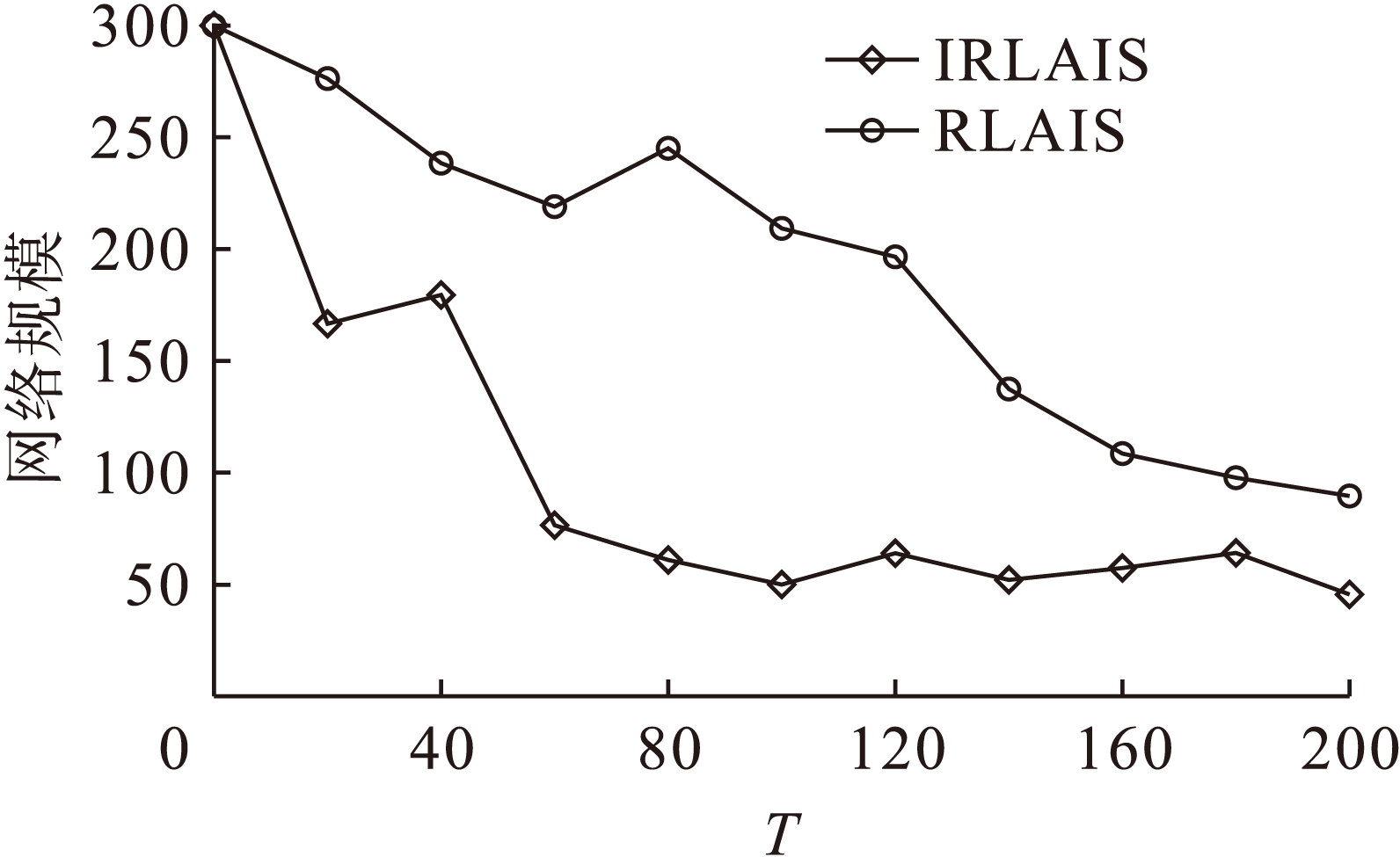 图4为IRLAIS与RLAIS在进化过程中网络规模变化对比.由图4可知,IRLAIS每代进化更有效,能以更少的迭代次数达到稳定,且最终网络规模较小.连接阈值NAT随ARB进化增大,更能反映ARB实际状态,使网络连接更有效.每一代进化中刺激值高的ARB得到保存而免遭淘汰,促进了算法的收敛速度.