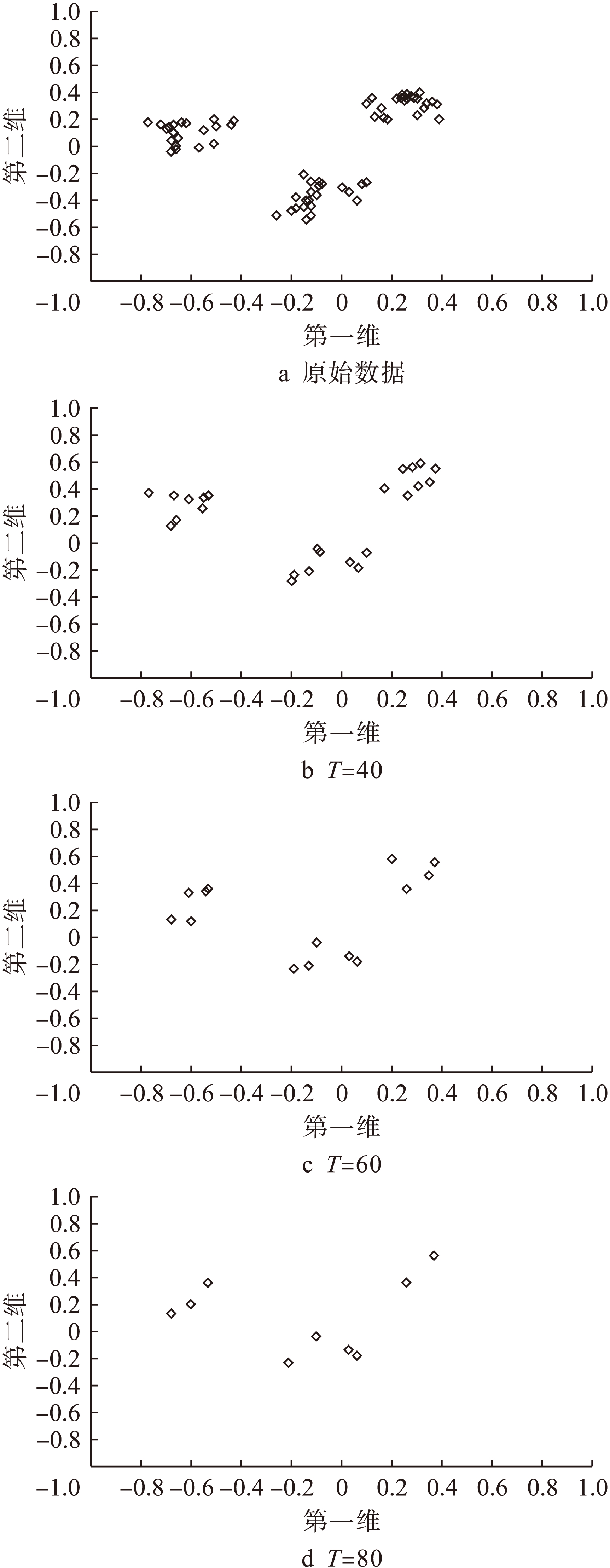 图3为网络结构与进化代数的关系.为了便于观察,每种故障模式中仅选取20个样本数据,鉴于高维数据在二维平面上无法表示,选择第一维和第二维为坐标轴进行绘制,且将数据归一化为[-1,1]区间.