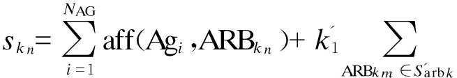 分别为子网k中ARB之间刺激和抑制作用的权重.第1项为ARBkn与抗原Agi∈Sag的匹配度;第2、3项分别为ARBkn所在子网k中其他ARBkm对ARBkn的刺激和抑制作用,ARBkm∈