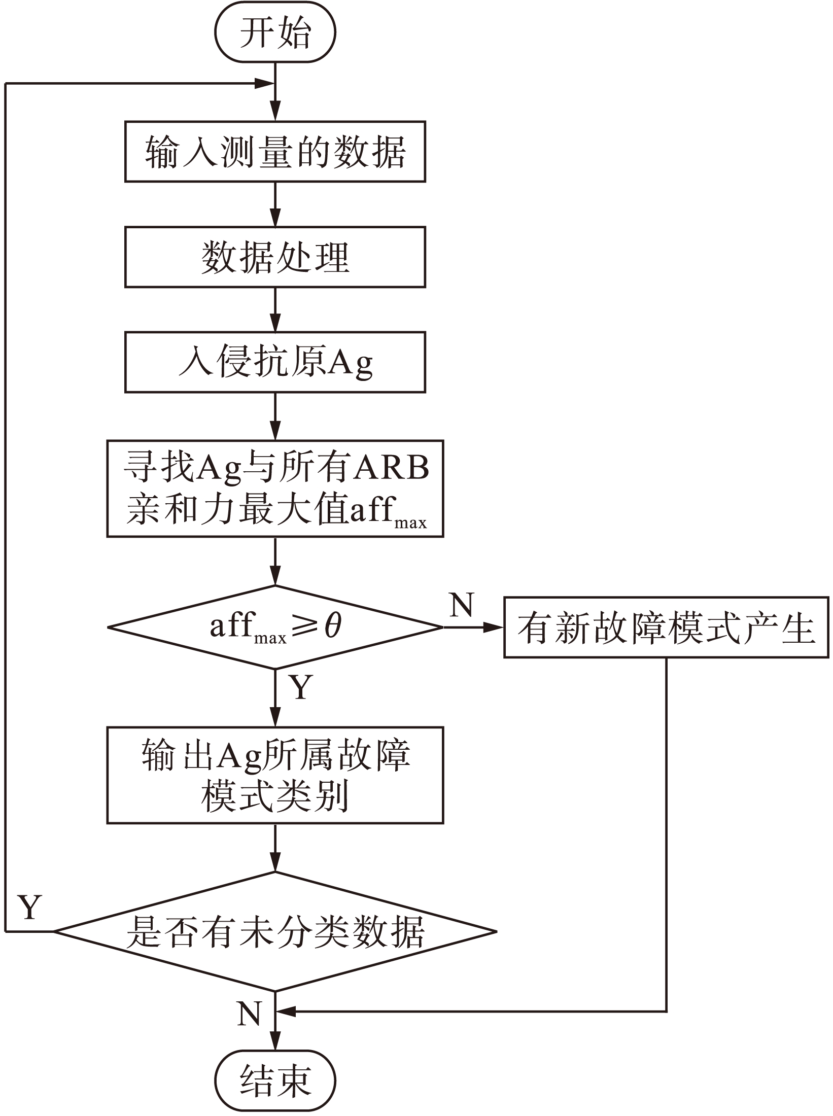 如果affmax≥θ,θ为新模式阈值,则Ag所属故障类别km为与其产生最高亲和力的ARB所属的ARB子网络的类别,即km=arg(affmax);否则,affmax<θ,表明出现新的故障模式,并进行报警.