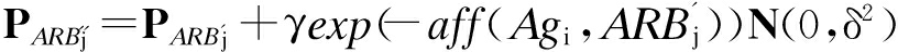 式中:⎣」为向下取整;∂为常数,用来限制每个ARBj得到的B细胞数目;sj为ARBj的刺激水平.由此可知,sj越高,得到的B细胞数量就越多.全部ARB获得B细胞总数为