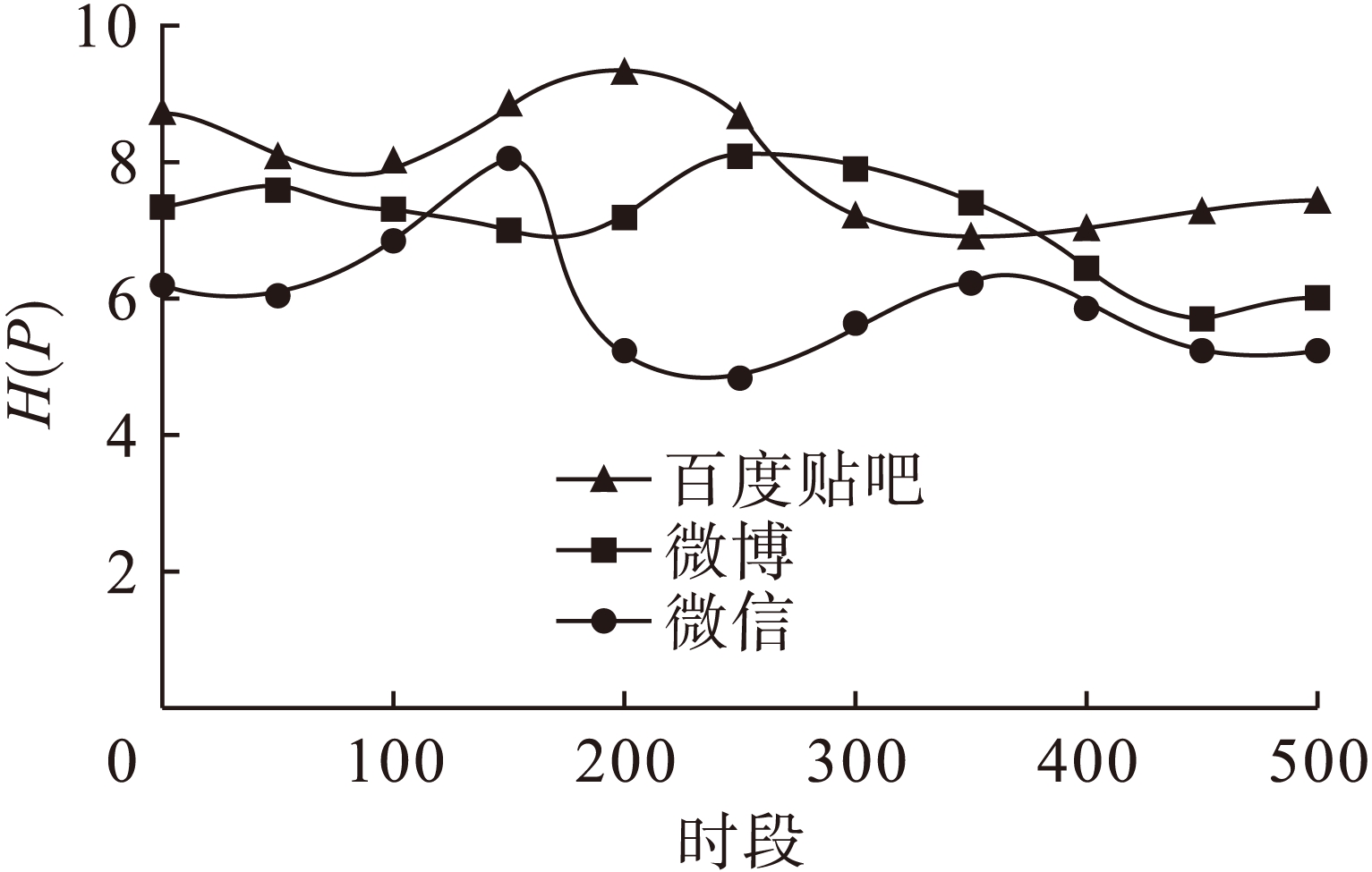 将情绪候选子集个数定位在22个,情绪信息I(t)不断叠加,时段序列t由1时段逐步演变到500时段,采集实验数据结果如图2所示.由图2同样可以看出,微信在网络上的情绪波动性最大.