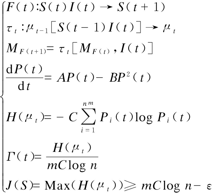 对于现实存在的任意情绪(染色体)实例S必然为π的一个真子集,即S∈π,当S演变到t阶段时,标识为S(t).关于情绪实例S(t)对环境F(t)的适应性描述,采用正实数序列来表示,假设刺激力参数A和内驱力参数B相等,设t时段环境F(t)所提供的信息为I(t),那么在适当调节因子τt的作用下,S(t)演化成新的情绪实例S(t+1)描述为
