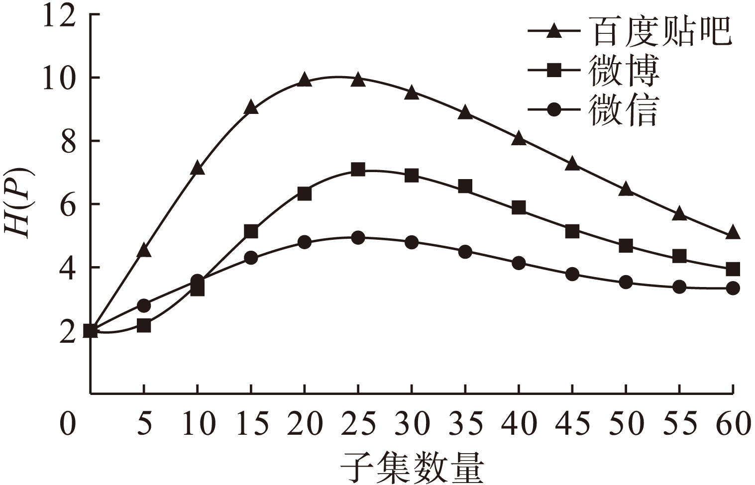 在实验中,将情绪候选子集的规模从10逐步调整到60.情绪推介活动显示:客户情绪熵与种类子集规模的关系密切,如图1所示.可观察到通过250次时段的情绪演变,随着子集规模的增加,情绪推介活动使得情绪熵先是逐渐增加,然后又逐渐衰落.腾讯微信用户的熵值最低,微博用户的熵值居中,百度贴吧的熵值较高,显然,微信系统在网络上的情绪波动性最强列,同时情绪调整子集数要达到20~25个才能完成情绪推介的需要.