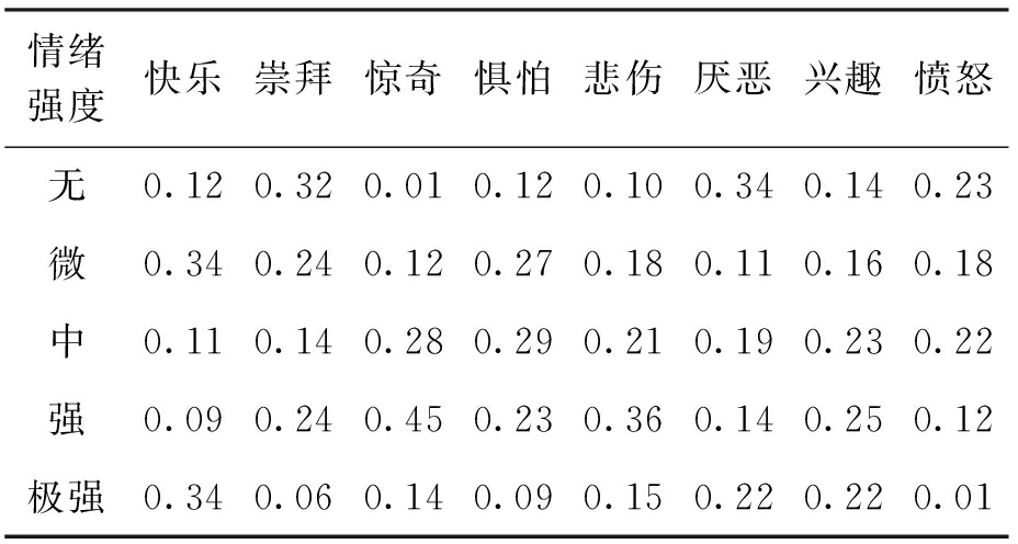选定一种交互型微信息系统,并随机抽取一批交互数据,按照上述8种刺激和5种情绪强度进行归类训练.例如:对于“快乐”这一情绪指标,10%的微文样本等级是“无”,40%的微文样本是“微”,20%的微文样本是“中”,20%的微文样本是“强”,10%的微文样本是“极强”,于是确定A1(快乐)的值为