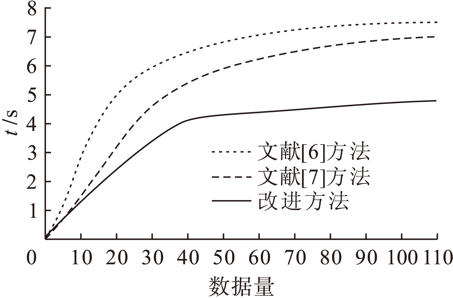 从图4可以看出,在调度数据量一定的情况下,采用改进方法进行数值调度,其调度时间约为4 s;采用文献[7]方法进行数值调度,其调度时间约为6.4 s;采用文献[6]调度时间约为7.2 s.改进算法相比文献[6]、文献[7]方法均有一定的优越性.