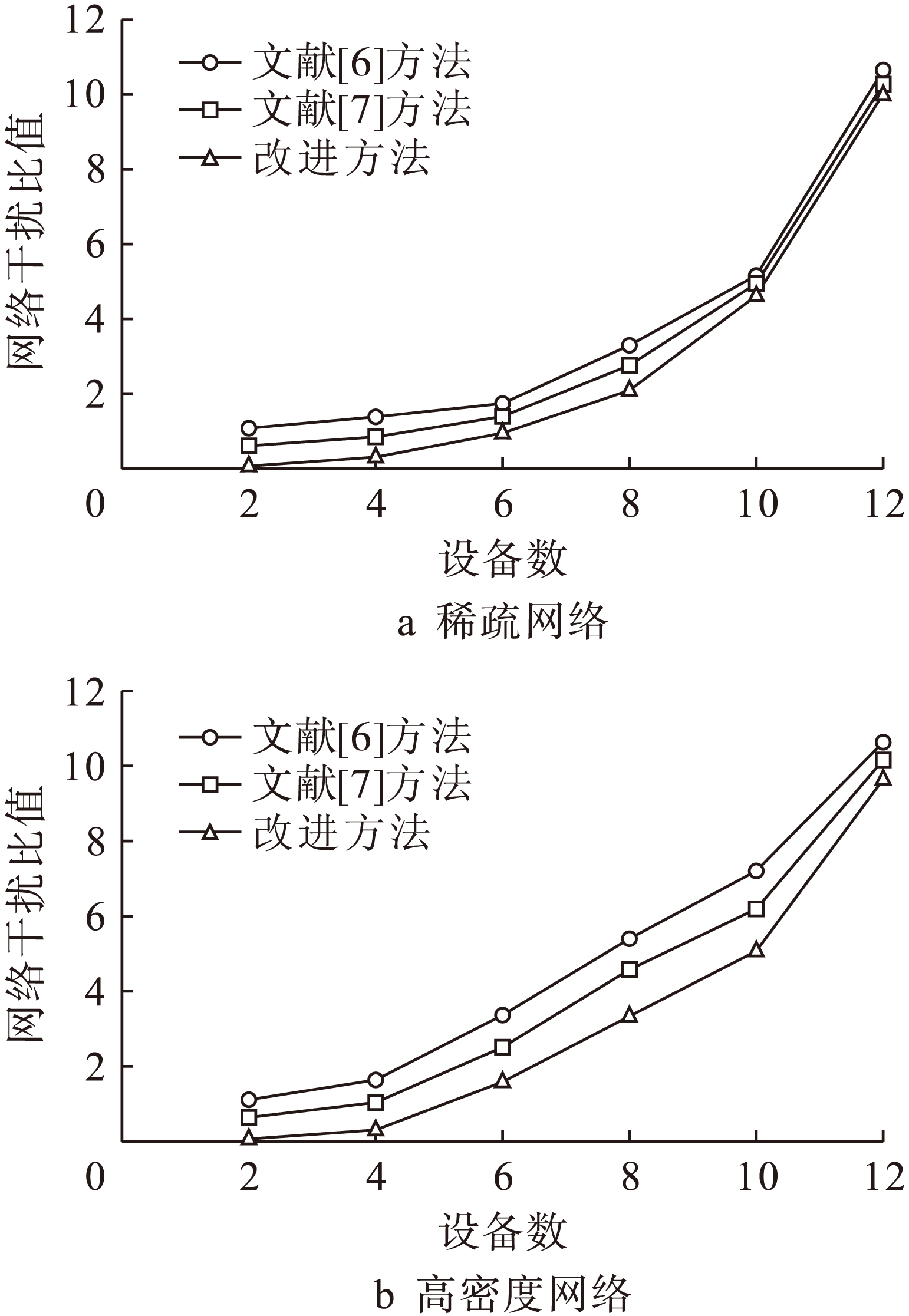 仿真实验中,将每个网络节点都配备2~12个设备,其中,在24个信道的稀疏和高密度网络环境下,网络干扰比值比较结果如图5所示.由图5a可知,与其它传统算法相比,本文算法下网络干扰比值最小,在24个信道和4个设备的配置环境下,本文算法、文献[6]、[7]计算的网络干扰比值分别为0.269,1.767,1.228,本文算法平均网络干扰值相对文献[6]、[7]分别降低了84.8%和78.1%.由图5b可知,与稀疏网络相比,高密度网络环境下的网络拓扑结构的节点数和链路数量增多.通过分析可知,本文算法网络下计算的网络干扰比值最小,在4个设备的配置环境下,与文献[6]、[7]计算的网络干扰比值相比降低了87.1%和80.6%.