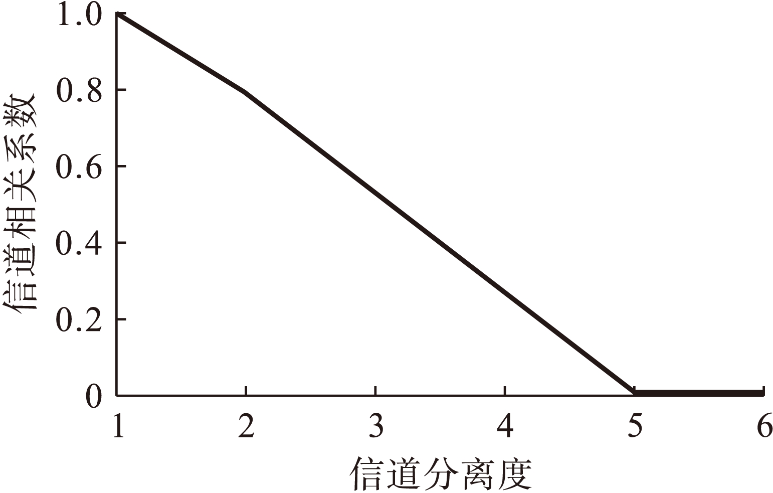 式中:K和b为信道的容量参数和噪声参数;ce为数据传输速率.不同信道e和e′的关联度参数Iee′和分离度是可以通过计算得出的,例如,对于IEEE 802.11信道分离度和相关性如图1所示,Ie1e1=1.0,Ie1e2=0.790 6,Ie1e3=0.526 7和Ie1e5=0.通过以上关系可以得出:信道拥塞条件下数据分配问题可以表示为