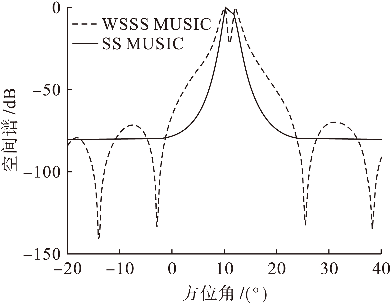 WSSS MUSIC算法不仅降低了噪声的影响,而且有效地利用了新接收数据信号子空间的信息,使得算法在低信噪比和少快拍数的非理想情况下,对邻近信号具有较高的分辨率,其空间谱函数为
