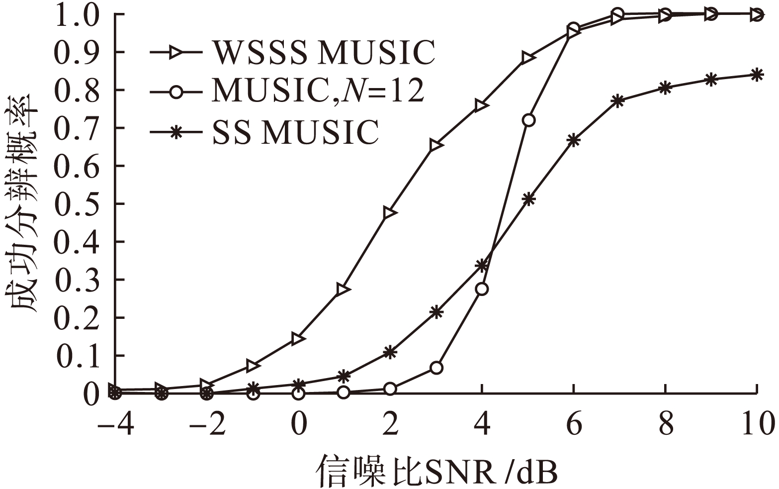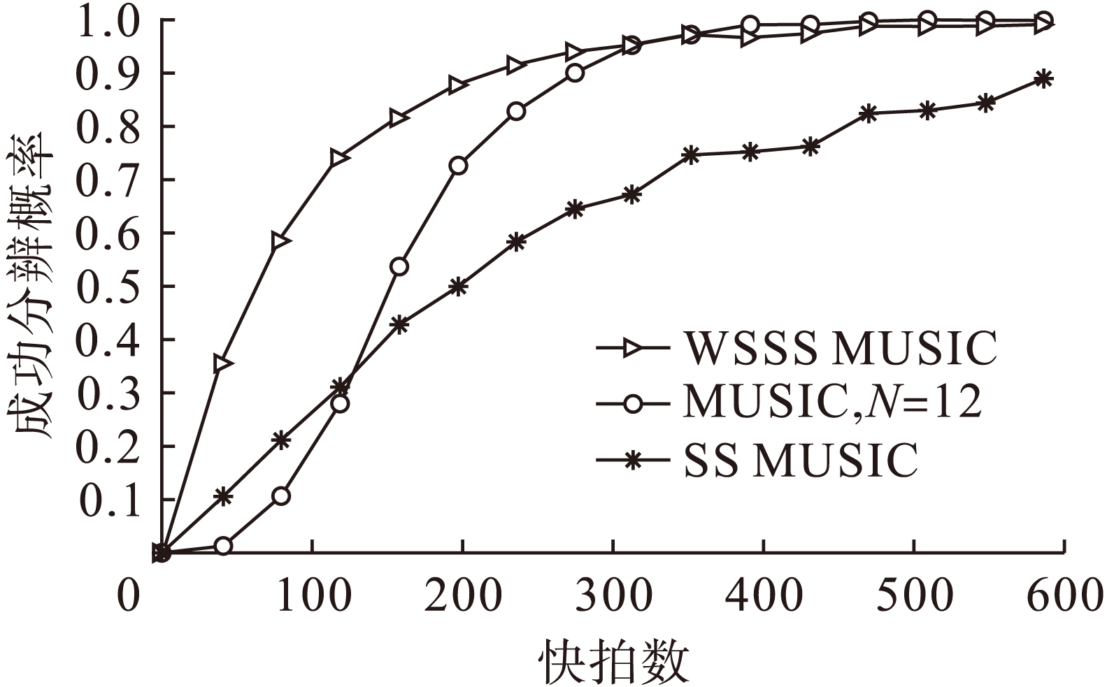 由图5可以看出,在信噪比一定的条件下,三种算法对邻近信号的成功分辨概率均随着快拍数的增加而增大.而在快拍数较少时,WSSS MUSIC算法对两个邻近信号的成功分辨概率明显优于其他两种算法,在快拍数较大时,WSSS MUSIC算法的成功分辨概率几乎和12个阵元ULA的MUSIC算法同时达到1.
