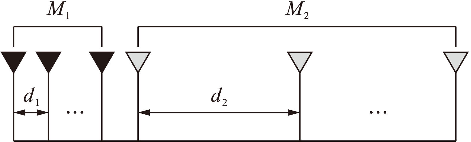 在阵元数固定的前提下,为了使相异值最多(自由度最大),文献[11]提出了一种基于KR积的阵列构造方式,称其为nested阵列.一个标准的二阶nested阵列是由两个相邻的均匀线阵(uniform linear arrays,ULA)串联构成的,内层的ULA有M1个阵元,阵元间距为d1,外层的ULA有M2个阵元,其阵元间距为d2=(M1+1)d1,则第1个ULA的阵元位置为S1={nd1,n=1,2,…,M1},第2个ULA的阵元位置为S2={m(M1+1)d1,m=1,2,…,M2},一个二阶nested阵列阵元总数为M=M1+M2,其结构示意图如图1所示.