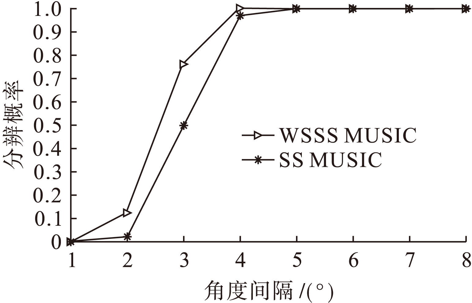 由图3可以看出,在低信噪比及小快拍数条件下,在角度间隔(小于5°)相同时,本文算法的分辨概率要比SS MUSIC算法高.而在识别成功率为1的前提下,本文算法有着更好的角度分辨率(角度间隔为4°).