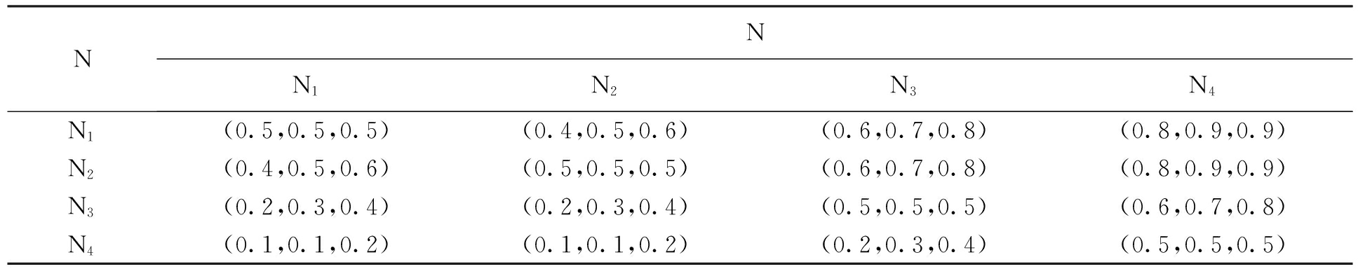 以元素P1(飞行计划的制定)为准则,在元素组N(领航技术)中建立评估基本面.元素组N中的元素指标N1(推测领航)、N2(基本无线电领航)、N3(改航)和N4(迷航处置)按照其对P1(飞行计划的制定)的影响大小进行间接优势度比较,构造出三角模糊数互补判断矩阵如表3所示.