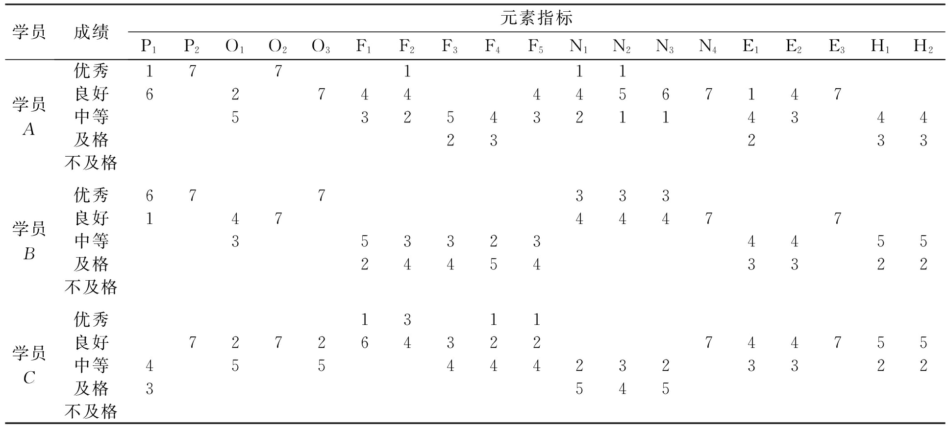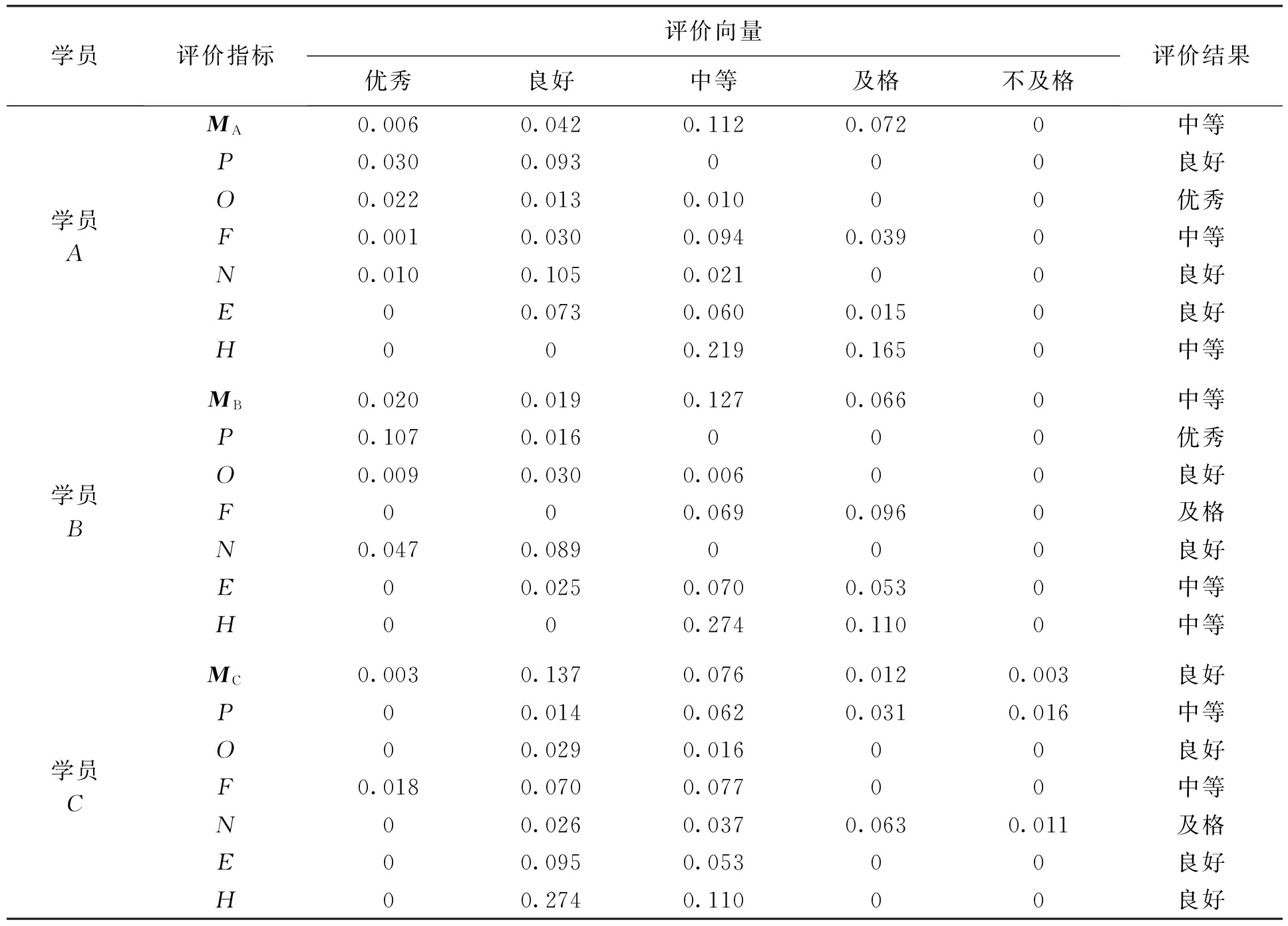 将统计结果利用模糊线性变换法构建相应学员各项指标的评价矩阵,以学员A为例,得出其各项指标的评价矩阵rA为