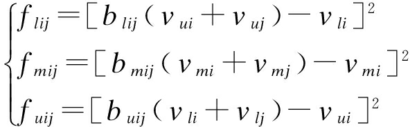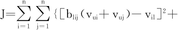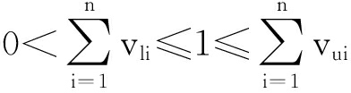 本文采用三角模糊数互补判断矩阵来表征专家对评价指标进行两两比较所给出的决策信息.三角模糊数互补判断矩阵表示为B=(bij)n×n,其中,bij=(blij,bmij,buij).设v=(v1,v2,…,vn)T为判断矩阵B的排序向量,分量vi=(vli,vmi,vui),则其偏差函数为