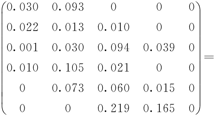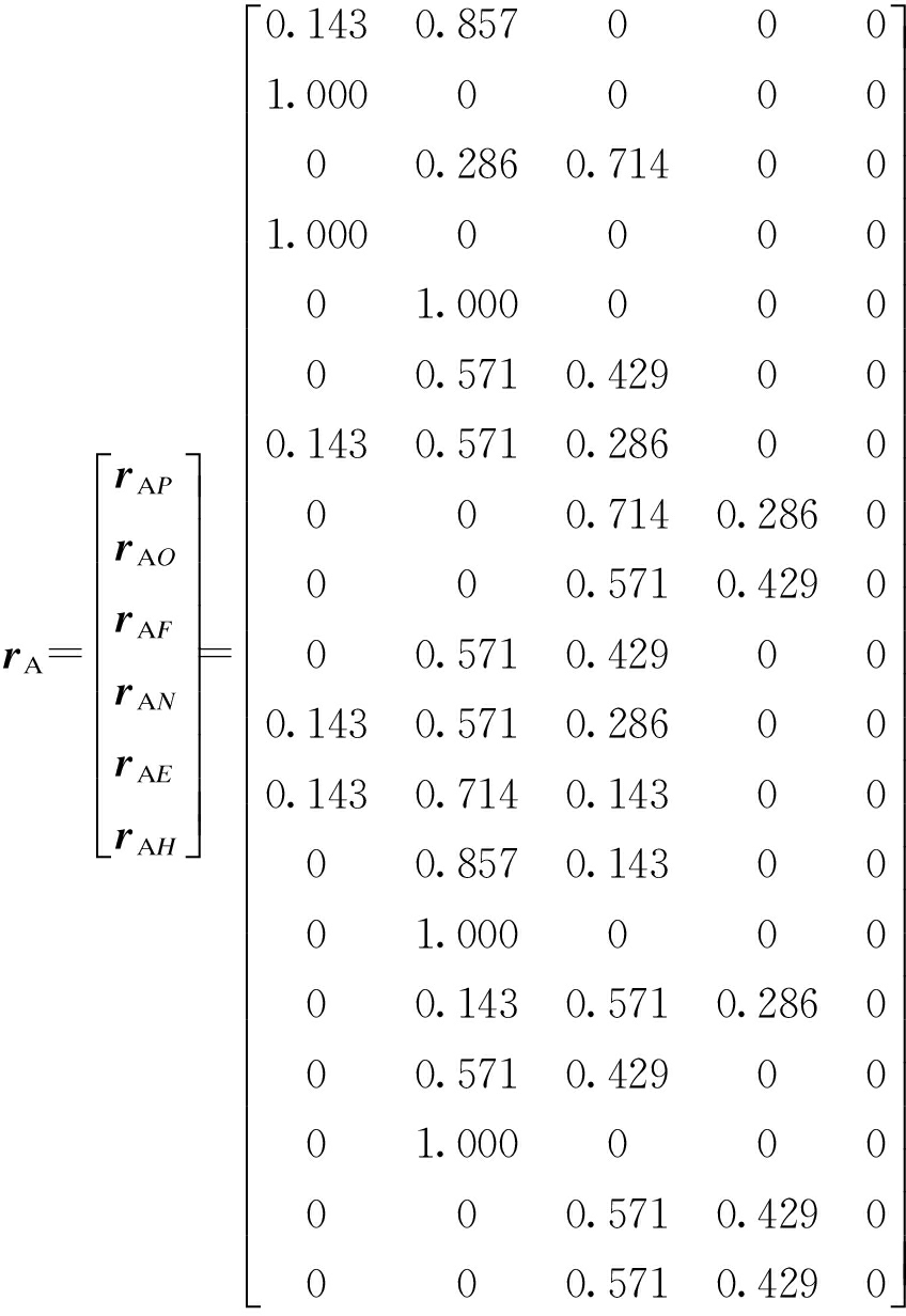 同理,可得机场运行评价向量RAO为(0.022,0.013,0.010,0,0);飞行技术评价向量RAF为(0.001,0.030,0.094,0.039,0);领航技术评价向量为RAN为(0.010,0.105,0.021,0,0);应急操作评价向量RAE为(0,0.073,0.060,0.015,0);人为因素评价向量RAH为(0,0,0.219,0.165,0).根据RAP,RAO,RAF,RAN,RAE,RAH可构建飞行学员A的整体评价矩阵RA.