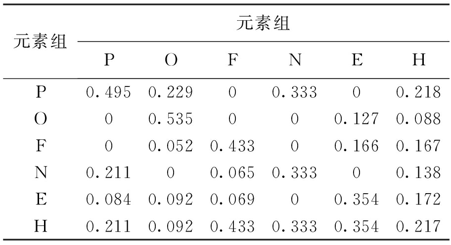 将归一化所求得的评价指标全局权重值转化为评价指标权重向量,按六个评价元素组计算得全局稳定权重向量W=(0.123,0.045,0.165,0.136,0.148,0.384),各评价元素组内稳定权重向量WP=(0.109,0.014),WO=(0.014,0.022,0.009),WF=(0.020,0.010,0.061,0.051,0.023),WN=(0.037,0.036,0.037,0.026),WE=(0.052,0.071,0.025),WH=(0.195,0.189).