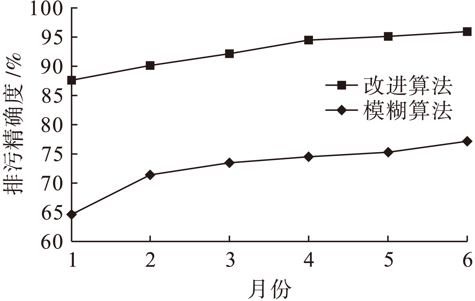 分别采用改进算法和文献[9]提出的模糊算法进行二甲基亚砜生产低污染控制实验.在不同的时间段内,分别将2种算法的控制精确度进行对比,对比结果如图1所示.