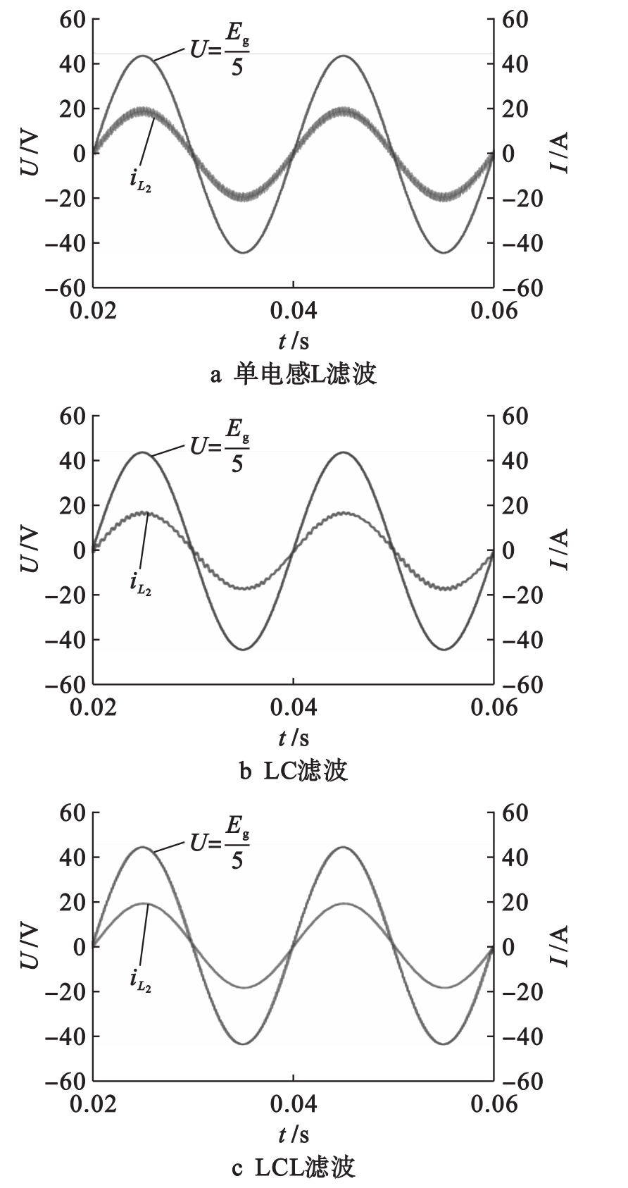 根据表1的参数搭建了单相光伏并网逆变器仿真模型,图7分别是单电感L、LC和LCL滤波条件下的输出电压电流波形.从图7中可以看出,在保持相同滤波参数的条件下,采用LCL滤波的光伏并网逆变器输出电流具有更小的谐波和畸变,表明LCL滤波器能够有效抑制高频谐波,且在滤波效果相同时,LCL滤波器具有更小的体积和损耗.