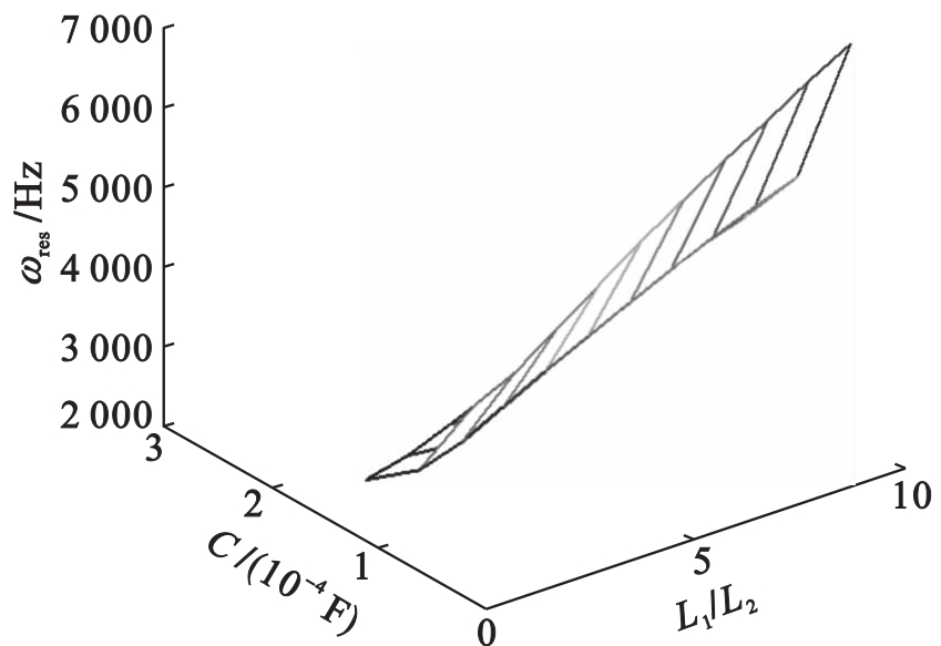 当总电感量L 1+L 2的取值为定值时,LCL滤波器固有的谐振频率ω res与L 1/L 2、滤波电容C的三维关系曲线如图5所示.从图5中可以看出,当保持滤波电容C的取值大小不变时,LCL滤波器的固有谐振频率随着L 1/L 2取值不断增大而呈现增加的趋势.而当保持L 1/L 2的取值固定不变时,LCL滤波器的谐振频率随着滤波电容C取值的增大而减小.当LCL滤波器的谐振频率较小时,会对系统的中低频信号进行放大而带来较大危害.