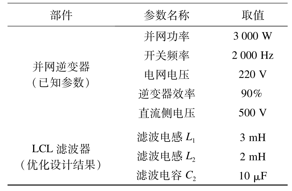 根据前面的分析可知,L 1/L 2取1.5为最佳,结合式(11)和式(12)计算可得出网侧电感的最优取值为L 2=2 mH.根据光伏并网发电系统实例,可优化求得LCL滤波器的各参数最佳取值,具体如表1所示.