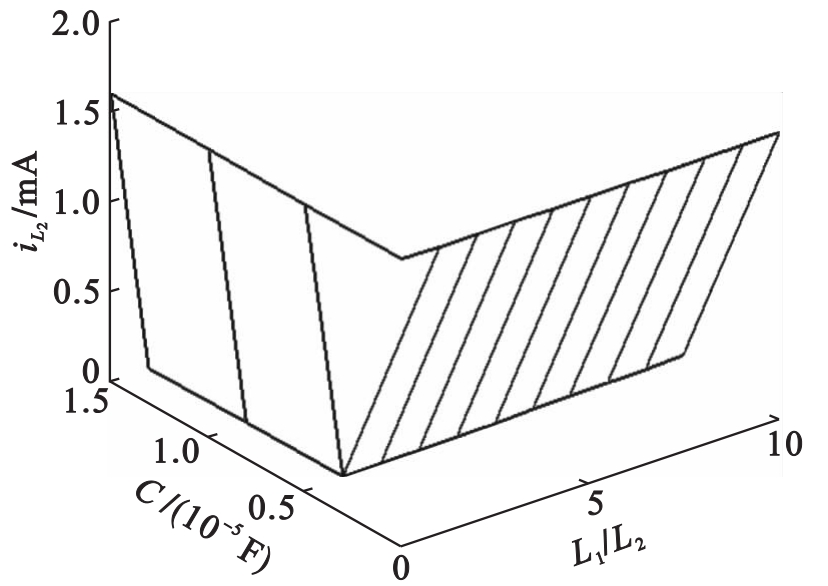 假设总电感量 L 1+L 2取值保持不变,在 h=400,谐波电压为单位幅值条件下,根据式(3)可以求得i L2、L 1/L 2与滤波电容C的关系曲线如图6所示.从图6可以看出,当滤波电容C的取值保持不变时,L 1/L 2取1~2时i L2的取值最小,且会随着L 1/L 2取值的不断增大而呈现增大的趋势.综合考虑取L 1/L 2的值为1.5时,LCL滤波系统具有最佳的滤波效果.