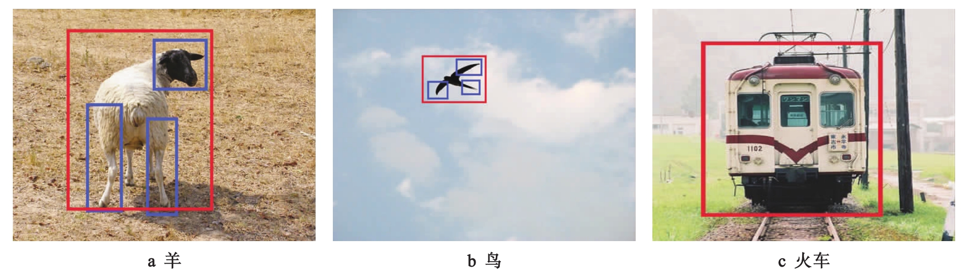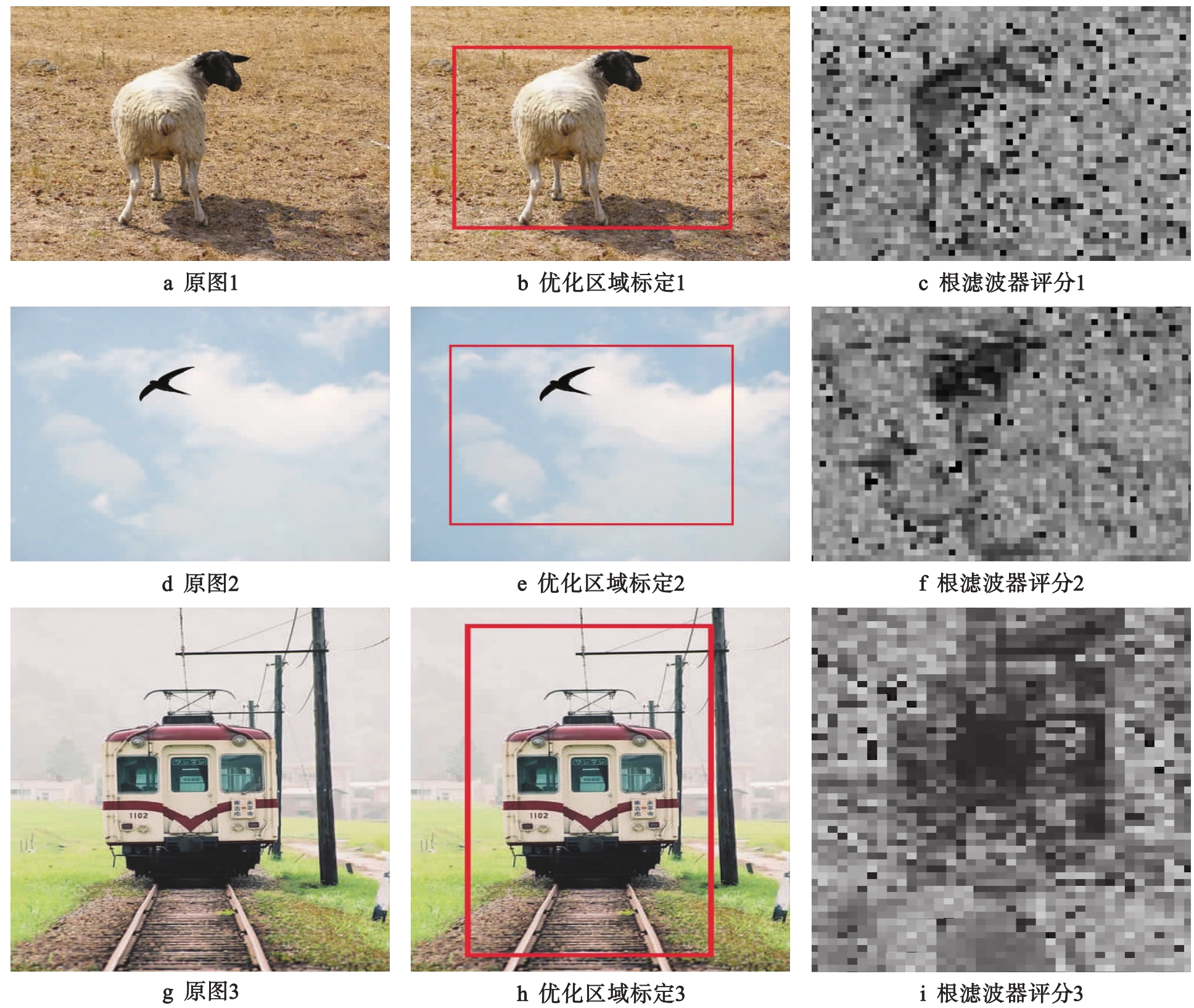 图4为3组图片的实验结果.3组图片中,第1组的检测目标为羊,第2组的检测目标为鸟,第3组的检测目标为火车.每组包含图片处理3个阶段的结果,分别为原始图像、对图像中心区域的标注、根滤波器对中心区域的评分,图像中亮度越暗,表示评分越高.