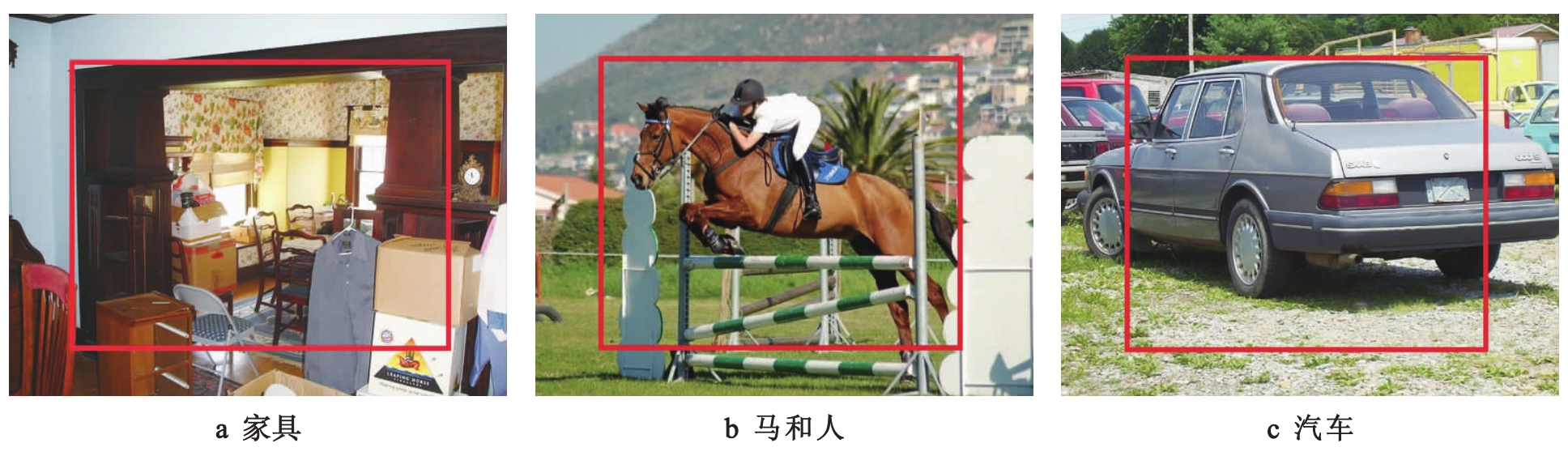 本文用红框标出图片的中心区域,如图1所示.图1a中的主要内容为家具,可以看出屋中绝大部分的家具都在红框范围内;图1b中的主要内容为马术比赛,马、人及其他关键目标都在红框范围内;图1c中的主要内容为汽车,图中最为明显的一辆汽车处于红框范围内.根据上述现象可以推断,检测窗口的位置应该优先寻找图片中间的区域,降低比较靠近图片边缘区域的优先级,这样就可以更快速地找到目标.