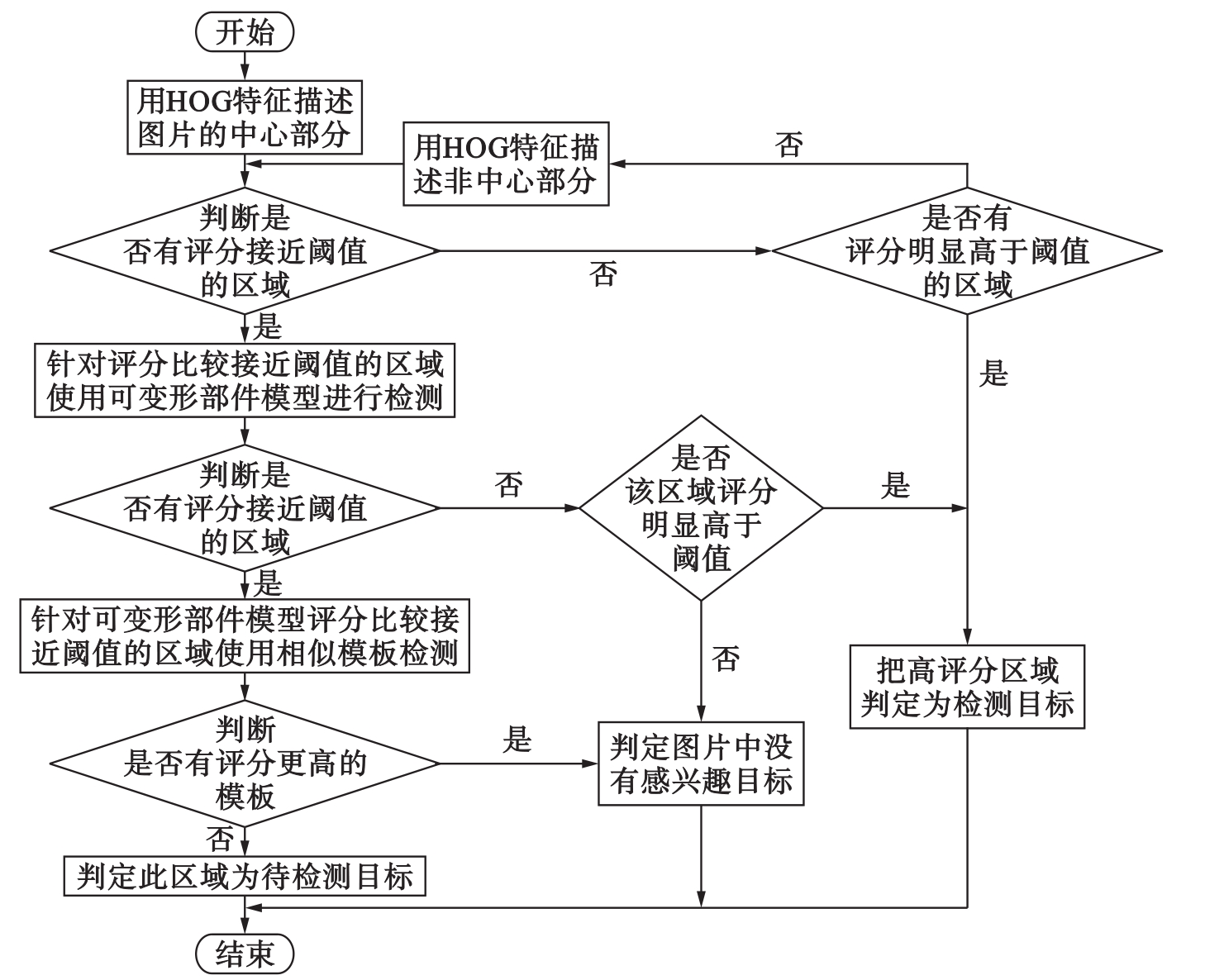 算法的检测首先是从图片的中心区域开始,可以尽可能快速地找到目标.如果某个区域评分非常高,可直接认定该区域为待检测目标,如果图片中出现了评分比较接近阈值的区域,则需要使用可变形部件模型进行更加精确地评分.由于可变形部件模型只用于评分较为模糊的区域,减少了不必要的计算,这对算法速度的提高有较大帮助.