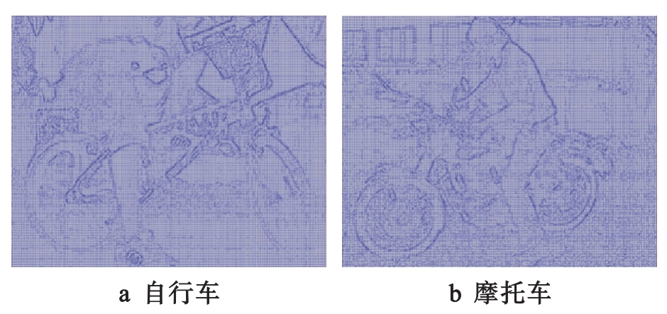 对于上述问题,本文采用关联分类的方法对这种干扰因素进行特殊处理.本文使用的数据集为PASCAL VOC 2007,其中包含20个分类.通过对这20个分类进行观察发现,从形状上可能产生相似性干扰的类别为:1)鸟和飞机;2)猫和狗;3)自行车和摩托车;4)牛、马和羊;5)巴士和轿车;6)巴士和火车;7)椅子和桌子;8)椅子和沙发.这些分类在提取边缘之后呈现出相似的边缘特性,如图2所示.图2a为自行车提取边缘后的结果,图2b为摩托车提取边缘后的结果,通过对比可以发现,自行车与摩托车的边缘特征是非常相似的.另外,对于这些数据集之外的其他分类也可能对检测结果产生干扰.例如,假设检测的目标是行人,但是待检测图片中包含猴子,由于猴子的外形与小孩相似,这可能产生把猴子错误地检测成小孩的情况,这样就会造成误检.