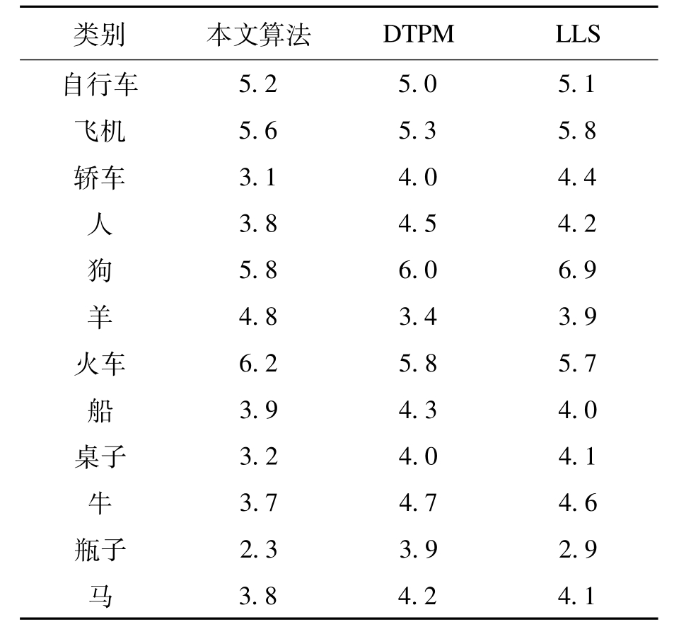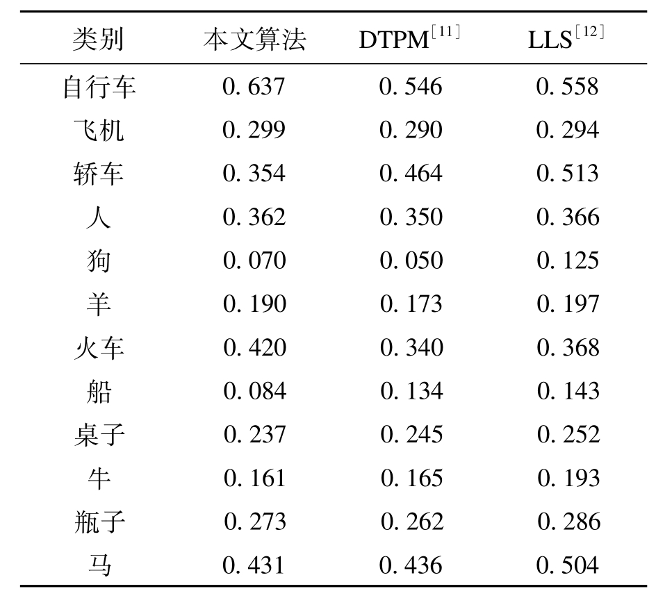 由表1可以看出,本文算法对于边缘轮廓有相似性的分类,如自行车、飞机、羊和火车的效果比较好,而对于相似性不大的分类,如船和轿车等的检测效果提升不明显,说明本文算法通过对模板相似性进行检测起到了提高准确率的作用,但是仅对图片中心大概率部分进行检测会丢失图片中的其他检测目标,从而降低准确率.
