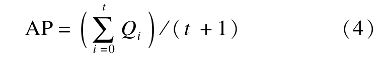 式中:t为对召回率所有值分成的份数;Q i为每个召回率中每个特定点对应的准确率.例如,计算AP时首先把召回率从0~1分成10等份,根据召回率分别为0,0.1,0.2,…,1.0的11个边界点上的正确率求平均值,则AP就等价于这11个点的平 均值 [13].