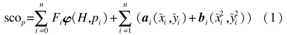 根滤波器和部件滤波器都是通过与滑动窗口中的HOG特征向量做点积(dot product)来评价目标.检测窗口的总评分(score)是窗口的根滤波器评分与结果子窗口中的部件滤波器评分之和,再加上区域评估.算法将具有 n个部件的目标模型定义为一个根滤波器 F 0和一组部件模型(P 1,P 2,…,P n),其中,P i=(F i,v i,s i,a i,b i),i=1,2,…,n,F i为第i个部件的滤波器;v i为一个二维向量,用来确定第i个部件相对于根滤波器的可能区域;s i给出了该区域的大小;a i和b i均为二维向量,用来确定方程系数.计算对第i个部件可能区域的评分,其表达式为
