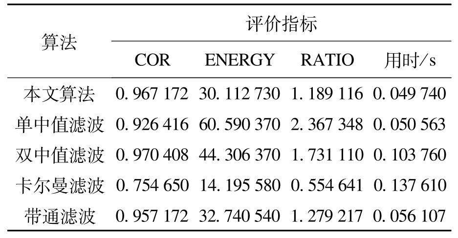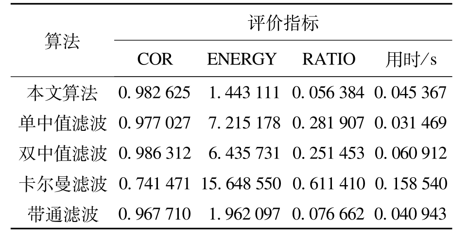实验证明,通过增加空域滤波,样本的滤波性能均得到了明显提升,滤波效果明显.下面给出验证该算法的3个评价指标,并且将其他4种常见滤波方法(单中值滤波、双中值滤波、卡尔曼滤波、带通滤波)与本文算法进行了横向比较.