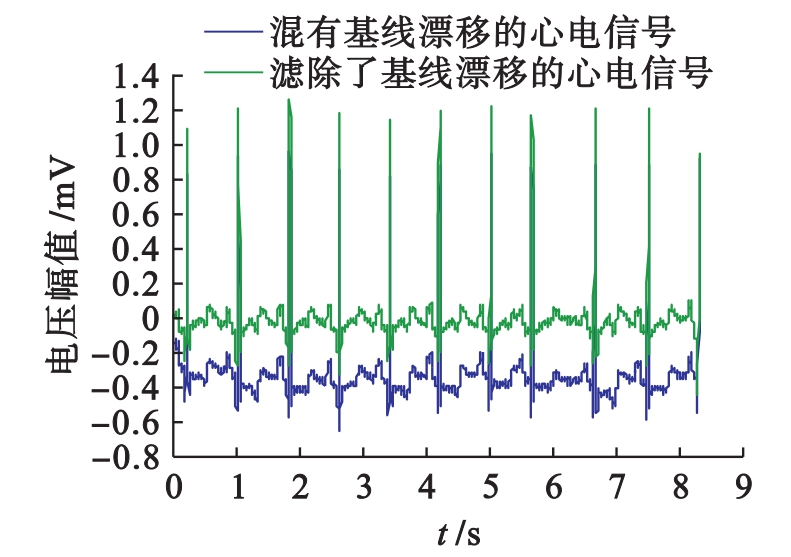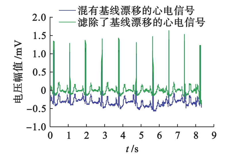 图2 中给出了 S 1滤除基线漂移信号前后的信号波形,可以看出原本存在于混合心电信号中的基线漂移成分被有效剔除了,且信号表征生理意义的波群被有效保存下来.