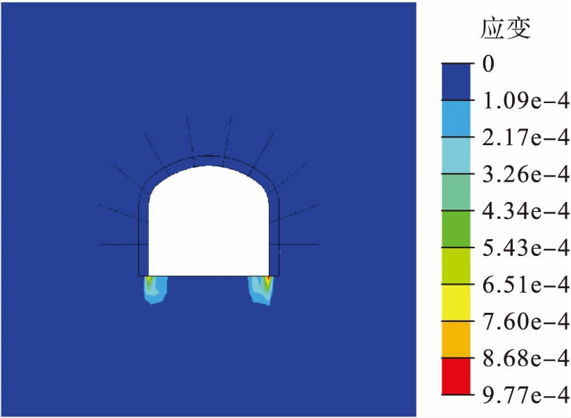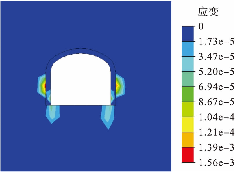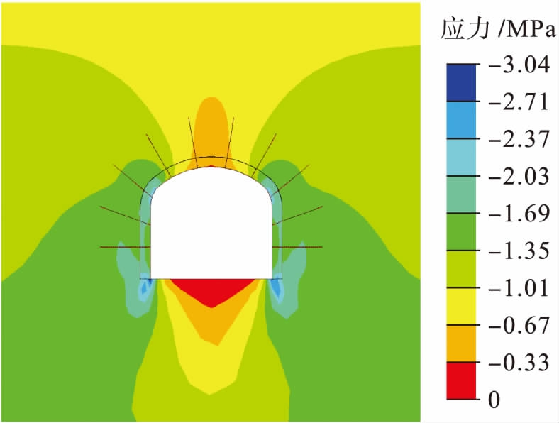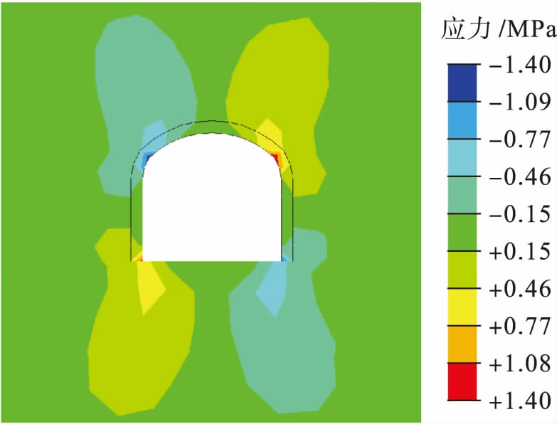 分析计算结果如图4~6所示.图4表明仅使用超前支护,拱顶塑性区的发展受到限制,而边墙及墙角塑性范围达到3 m以上,从墙角延至拱脚.图5表明在拱脚至拱腰段出现剪应力峰值,由于围岩自身较软且受节理裂缝切割,所以在持续爆破施工产生的扰动影响下易发生塑性剪切滑移导致边墙失稳,拱顶坍塌,与现场实际情况相符合.而钢拱架+钢筋网+喷砼+注浆支护方式与超前支护相结合的方式限制了洞周围岩的塑性发展,支护效果较好.